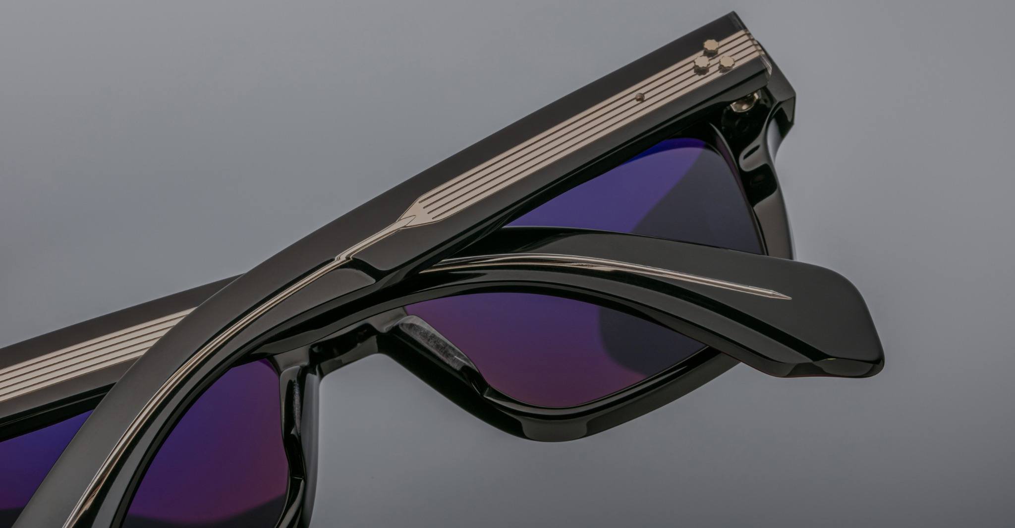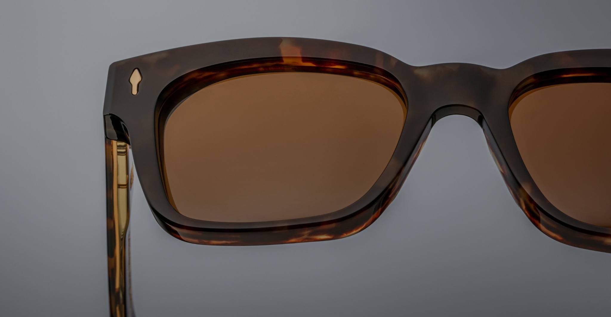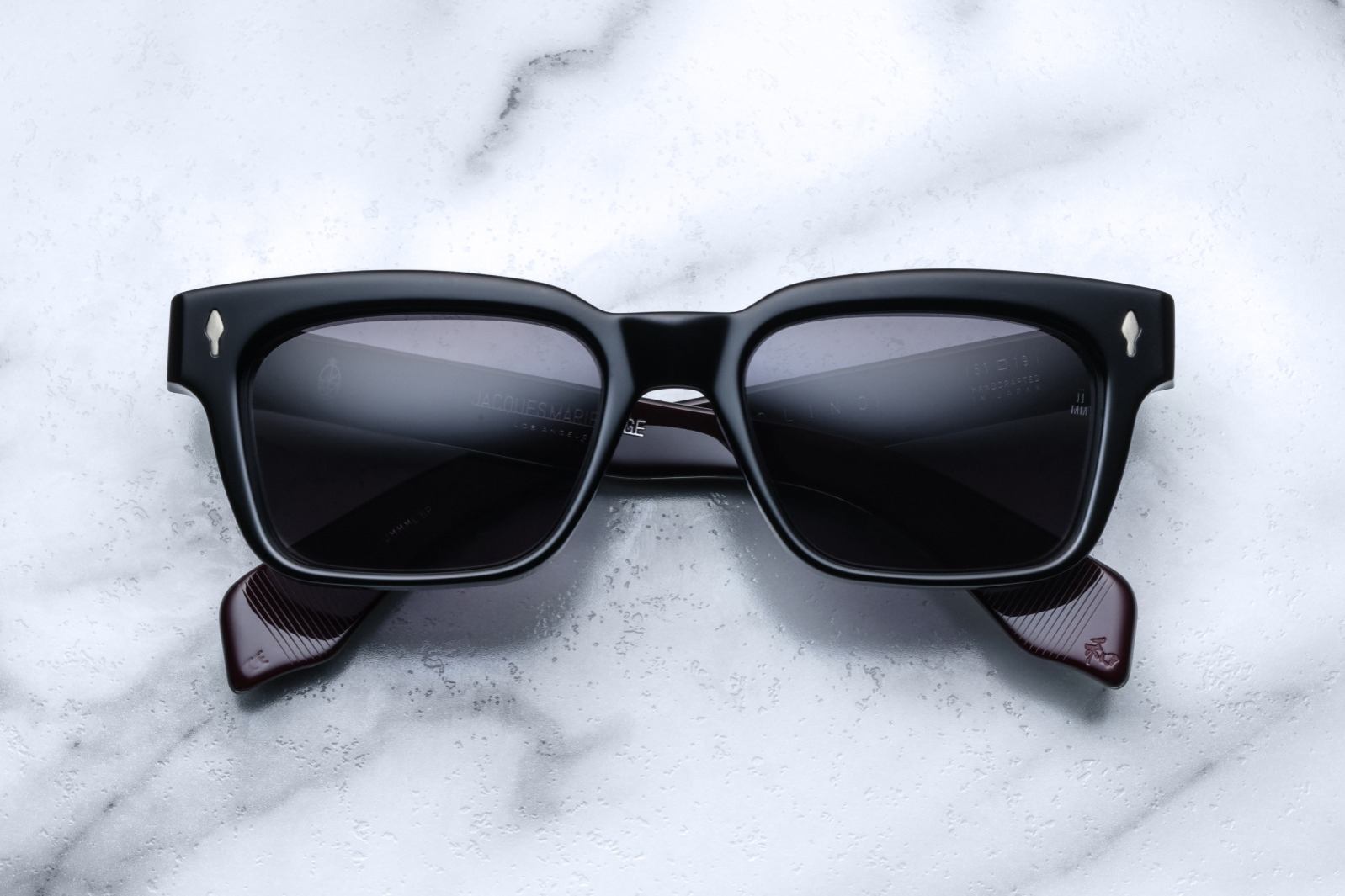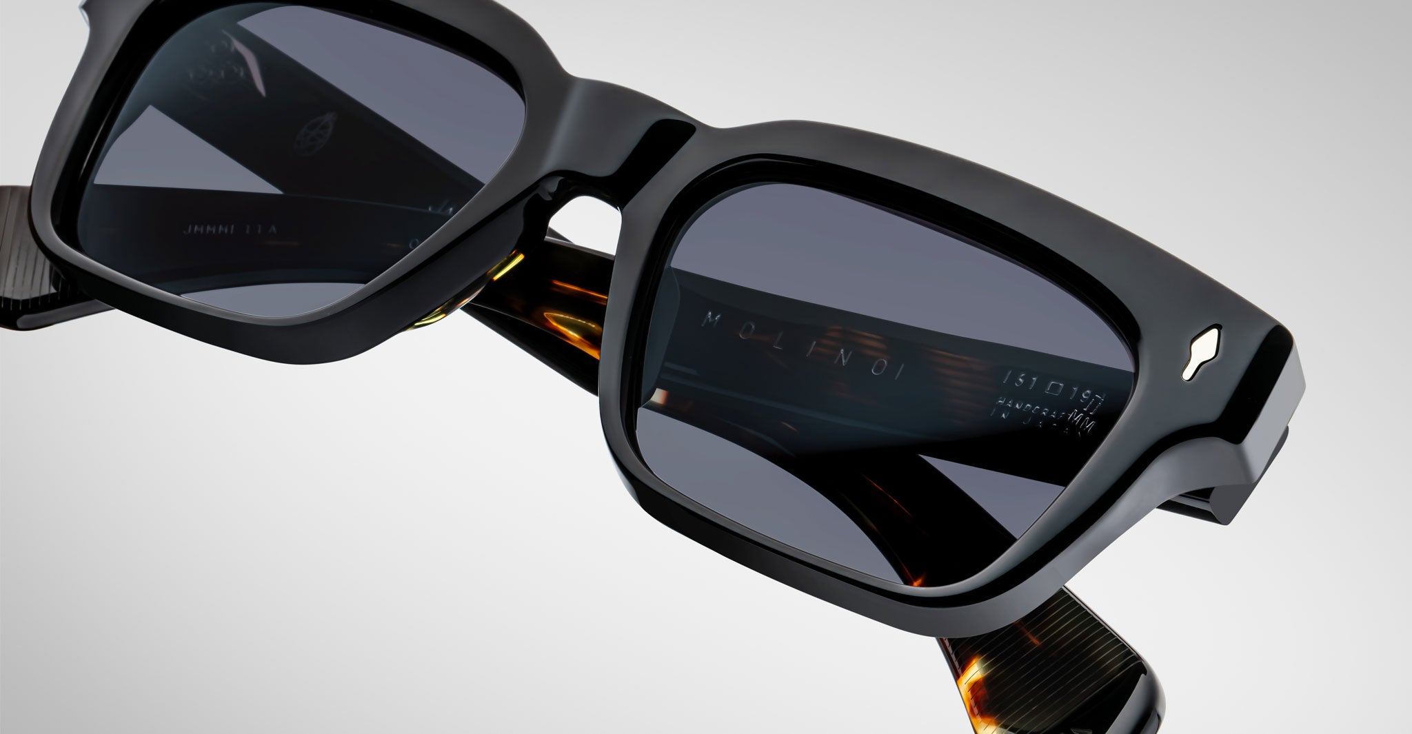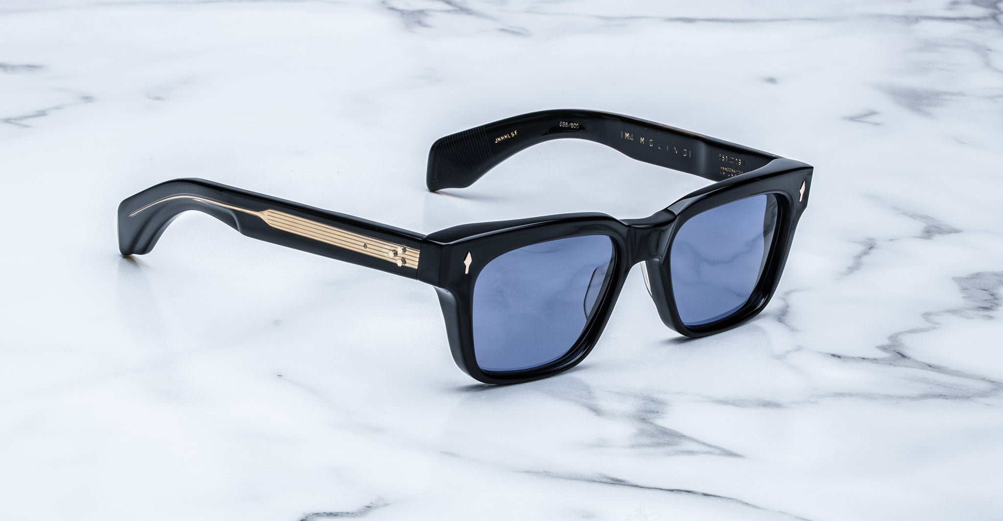 The Jacques Marie Mage Molino is a bold, wide rectangular sunglass inspired by 1960s design. It has a strong shape with sharp angles and fine bevel details, made from thick 10mm acetate. The temples are custom double-laminated and include special metal parts. This frame is named after Italian architect Carlo Mollino, known for his creative and artistic style.