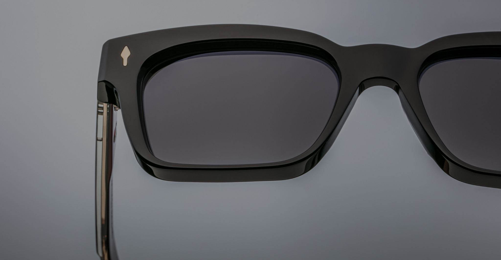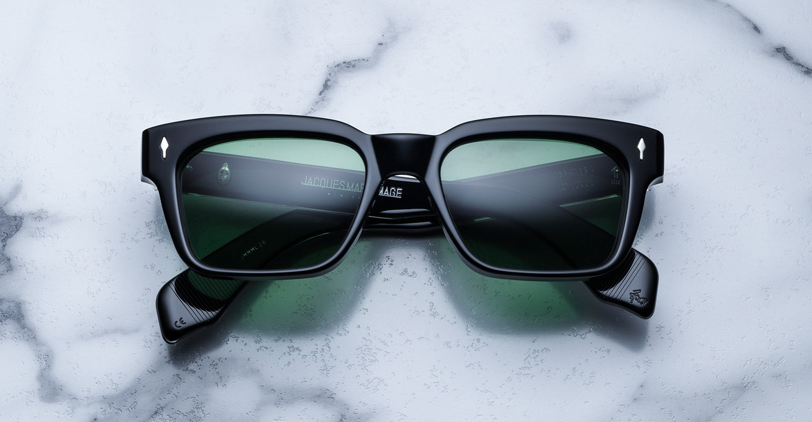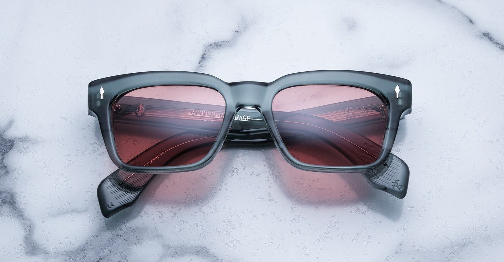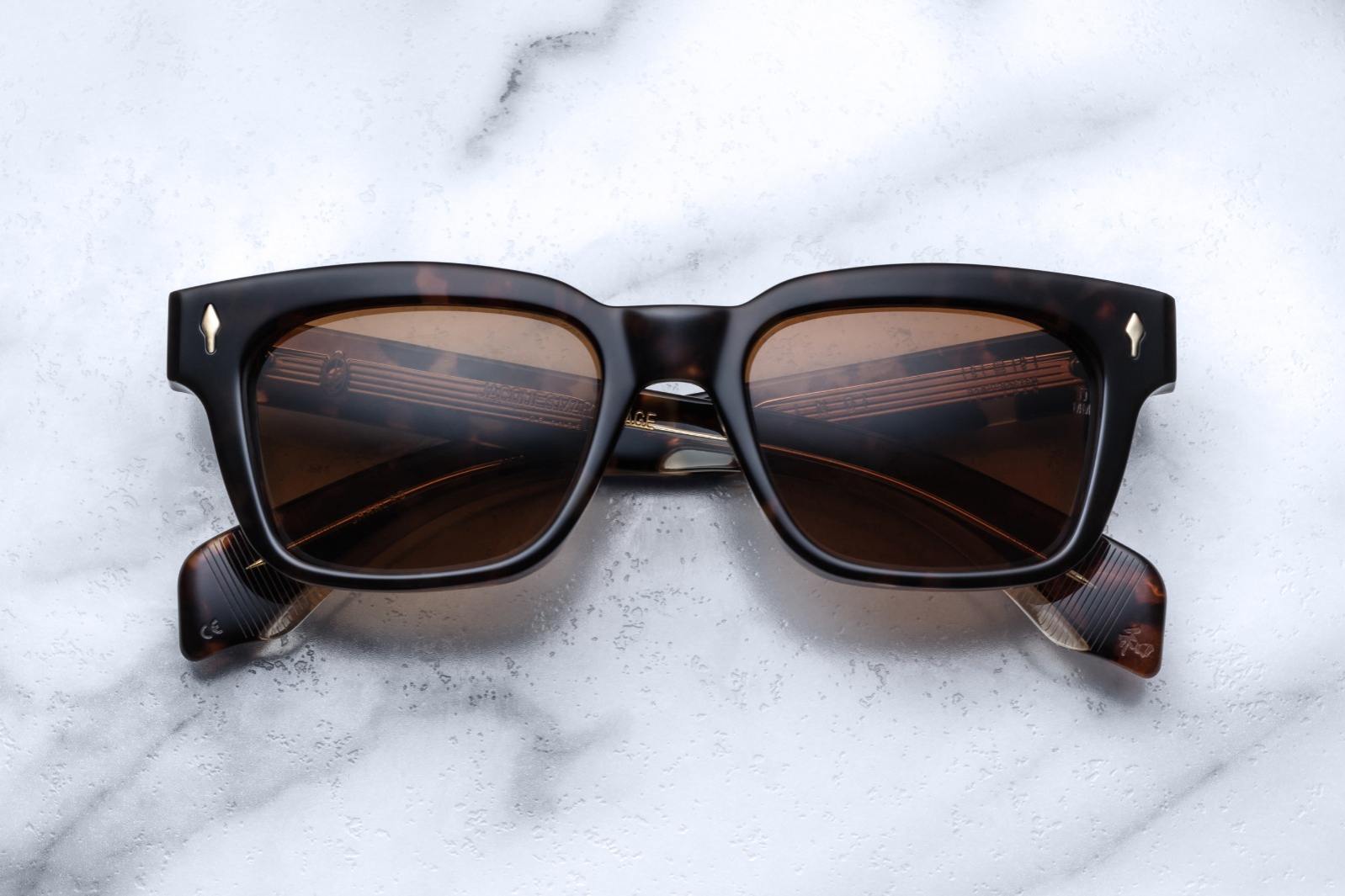 The Jacques Marie Mage Molino is a bold, wide rectangular sunglass inspired by 1960s design. It has a strong shape with sharp angles and fine bevel details, made from thick 10mm acetate. The temples are custom double-laminated and include special metal parts. This frame is named after Italian architect Carlo Mollino, known for his creative and artistic style.
