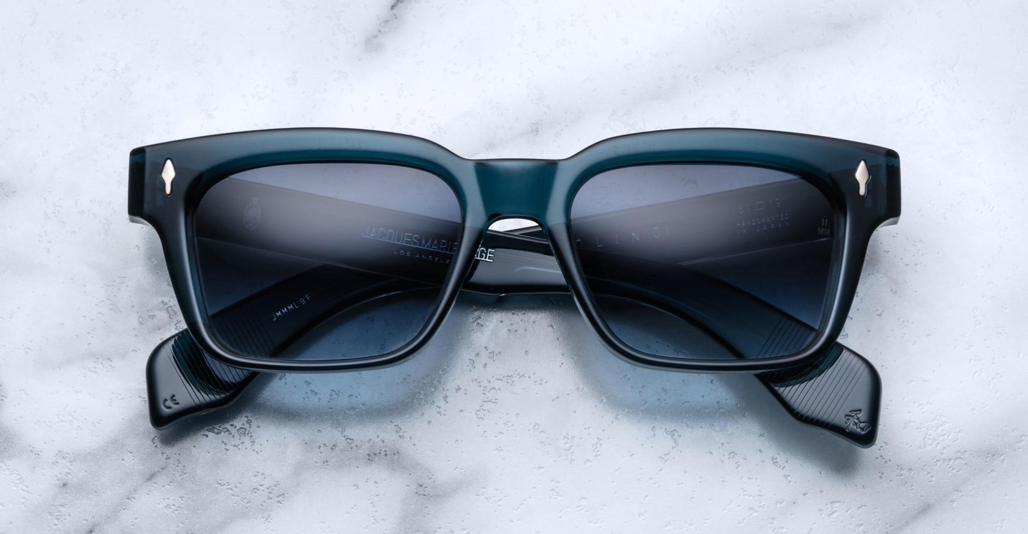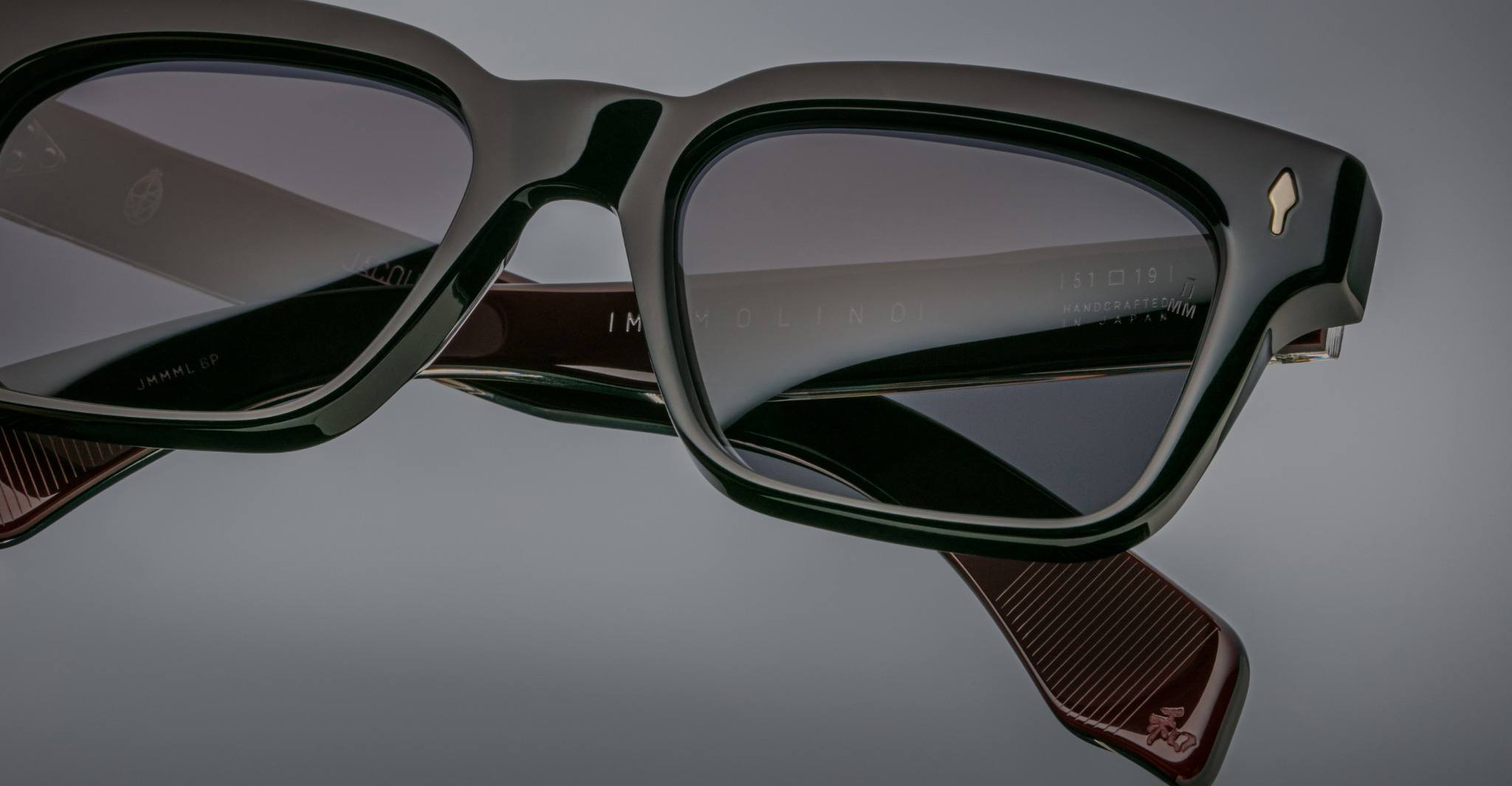 The Jacques Marie Mage Molino is a wide 60's angular design with a rectangular lens shape made of 10mm block acetate with custom double-laminated acetate temples, featuring precious metal hardware.