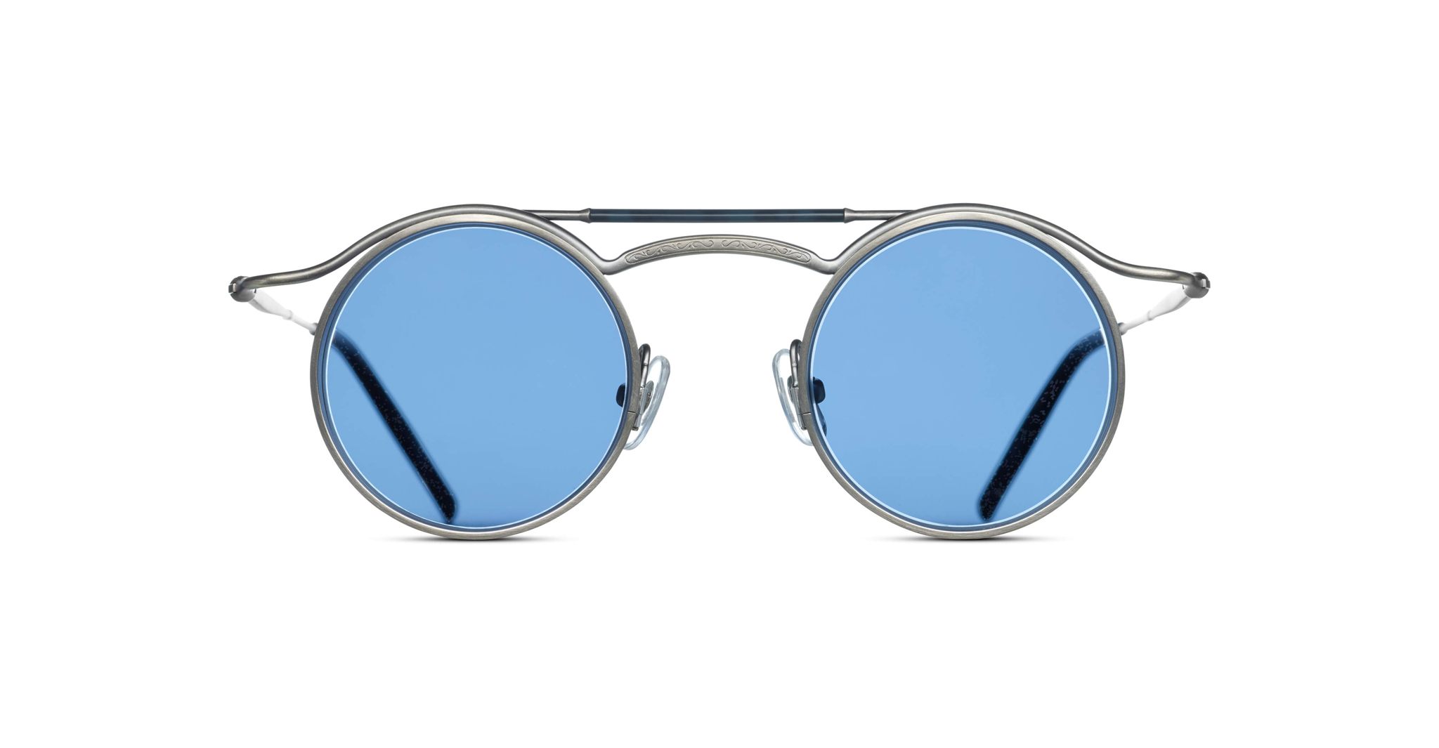 Matsuda's 2903H sunglass is a striking round creation with strong architectural lines, exuding an industrial feel. Ribbed detailing, visors, and an elegant lacquered top bar all lend a nod to the Machine Era of the early 20th century. From the Heritage Collection