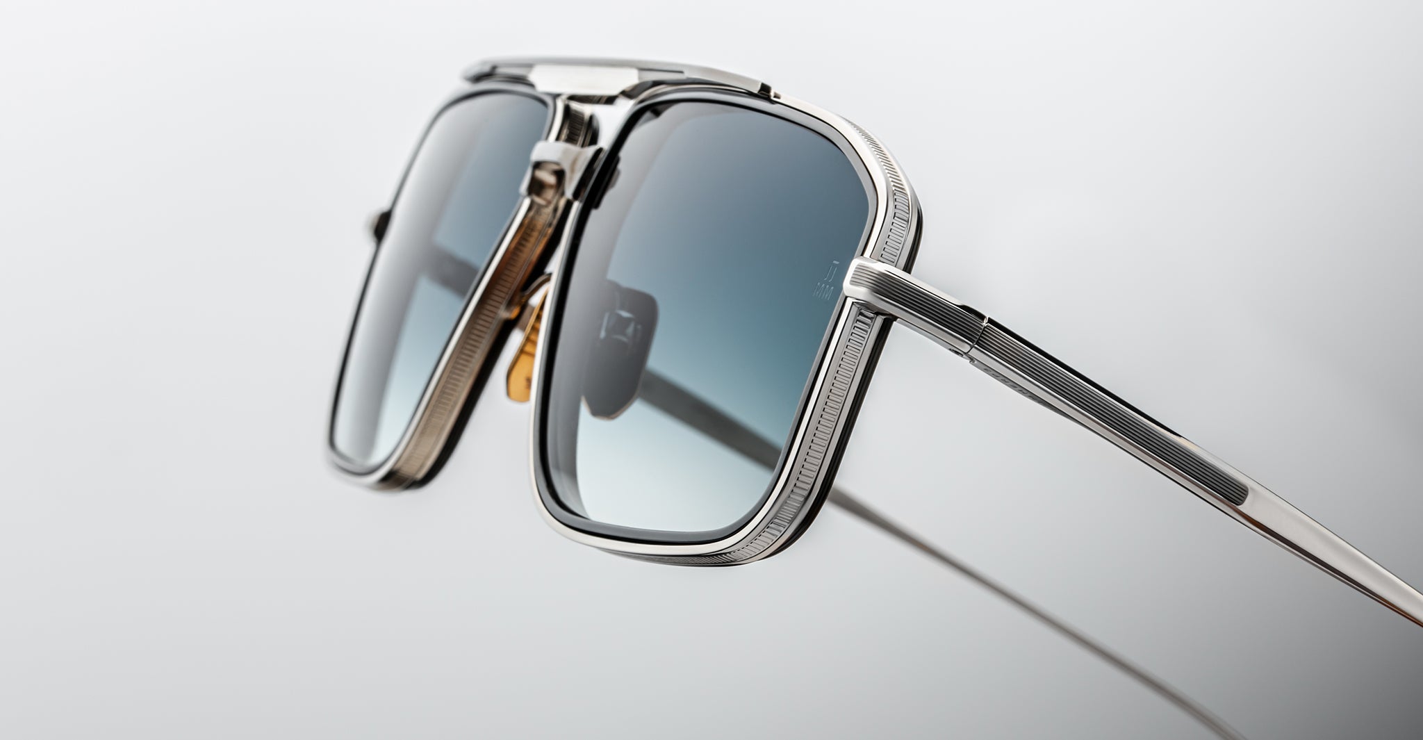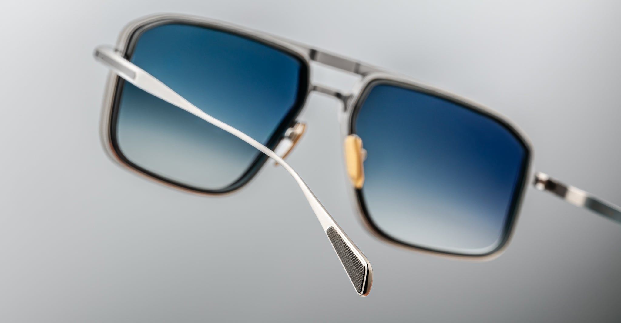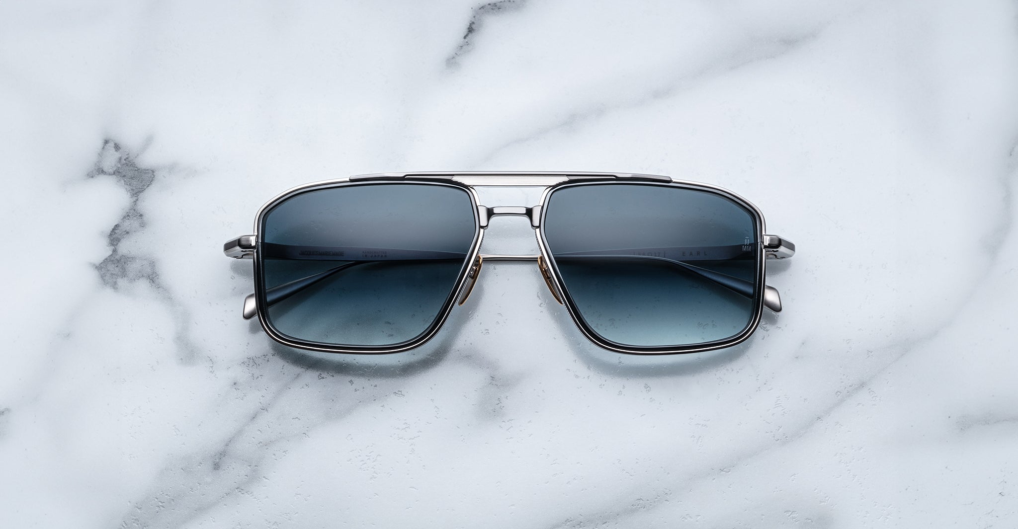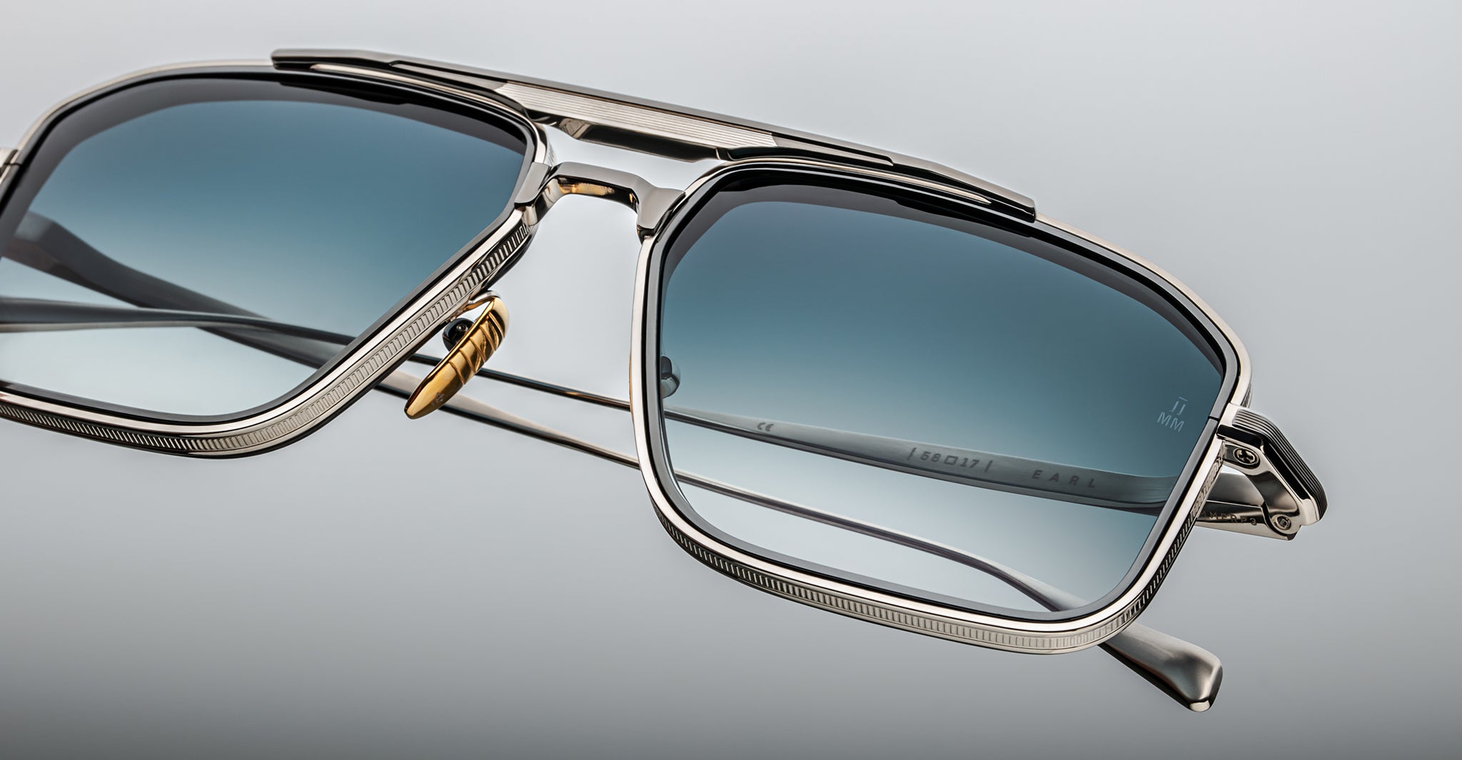 Earl is a sleek 70s-inspired titanium navigator sunglass with unique 4mm titanium lens rim inserts and dual-tone brow and temple details with JMM's signature Art Deco embellishments.