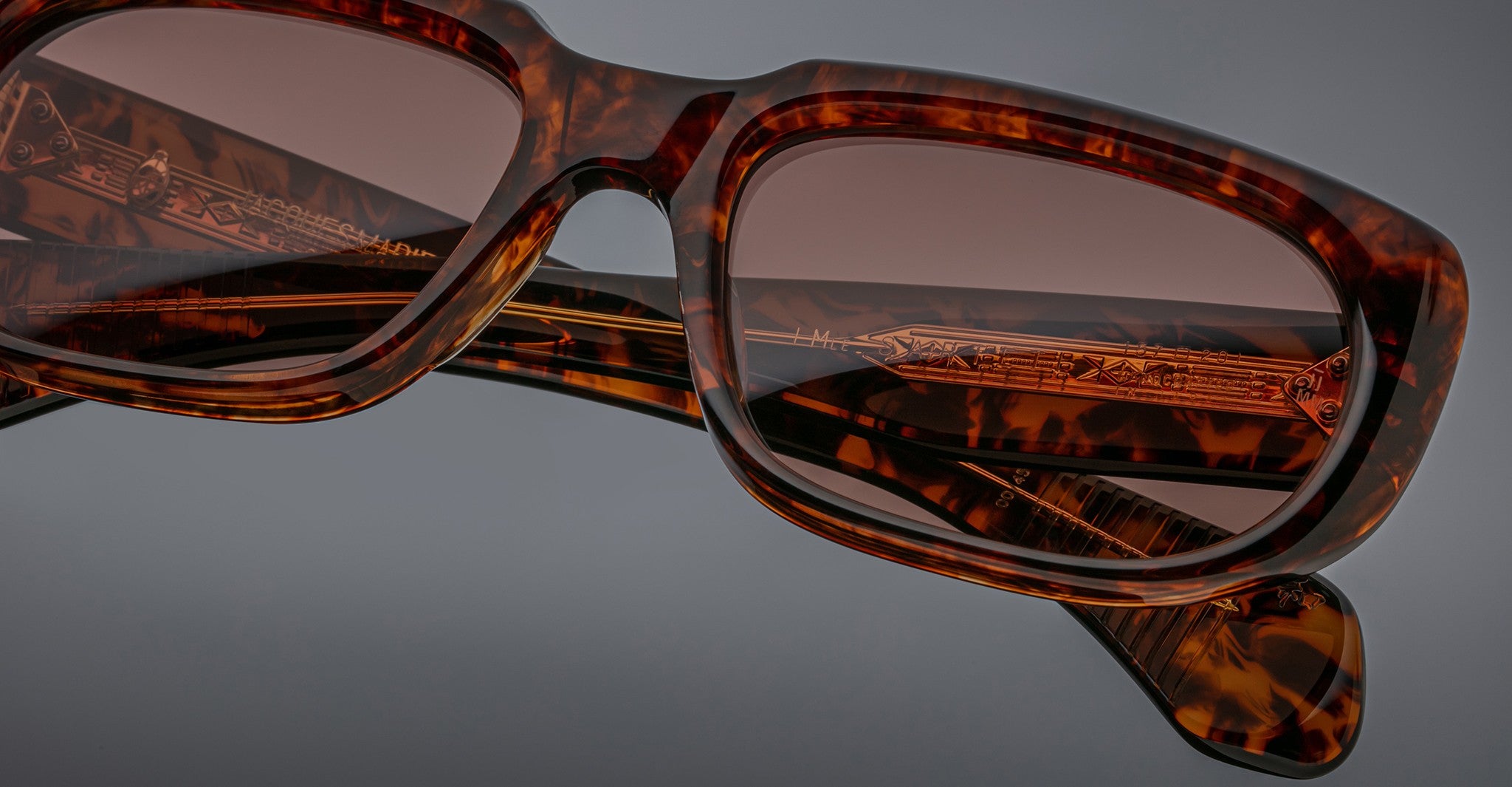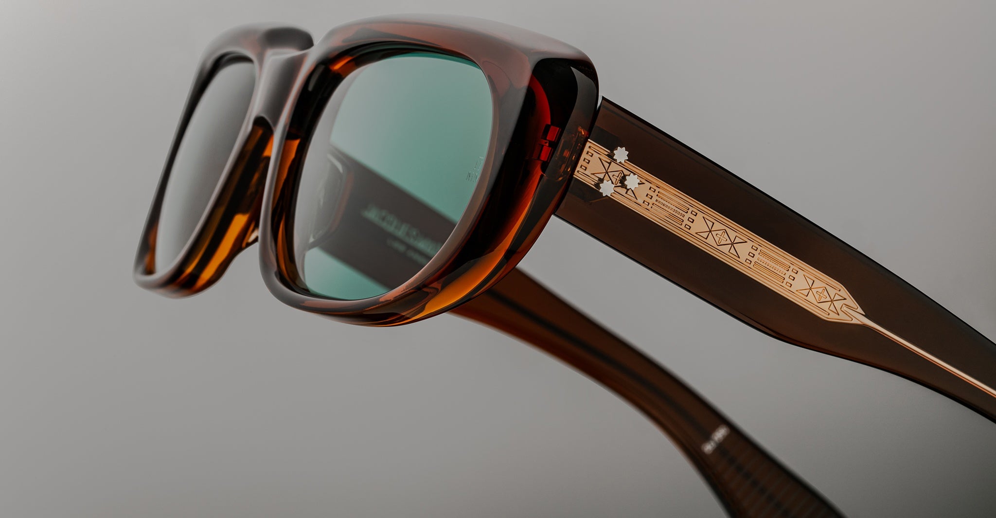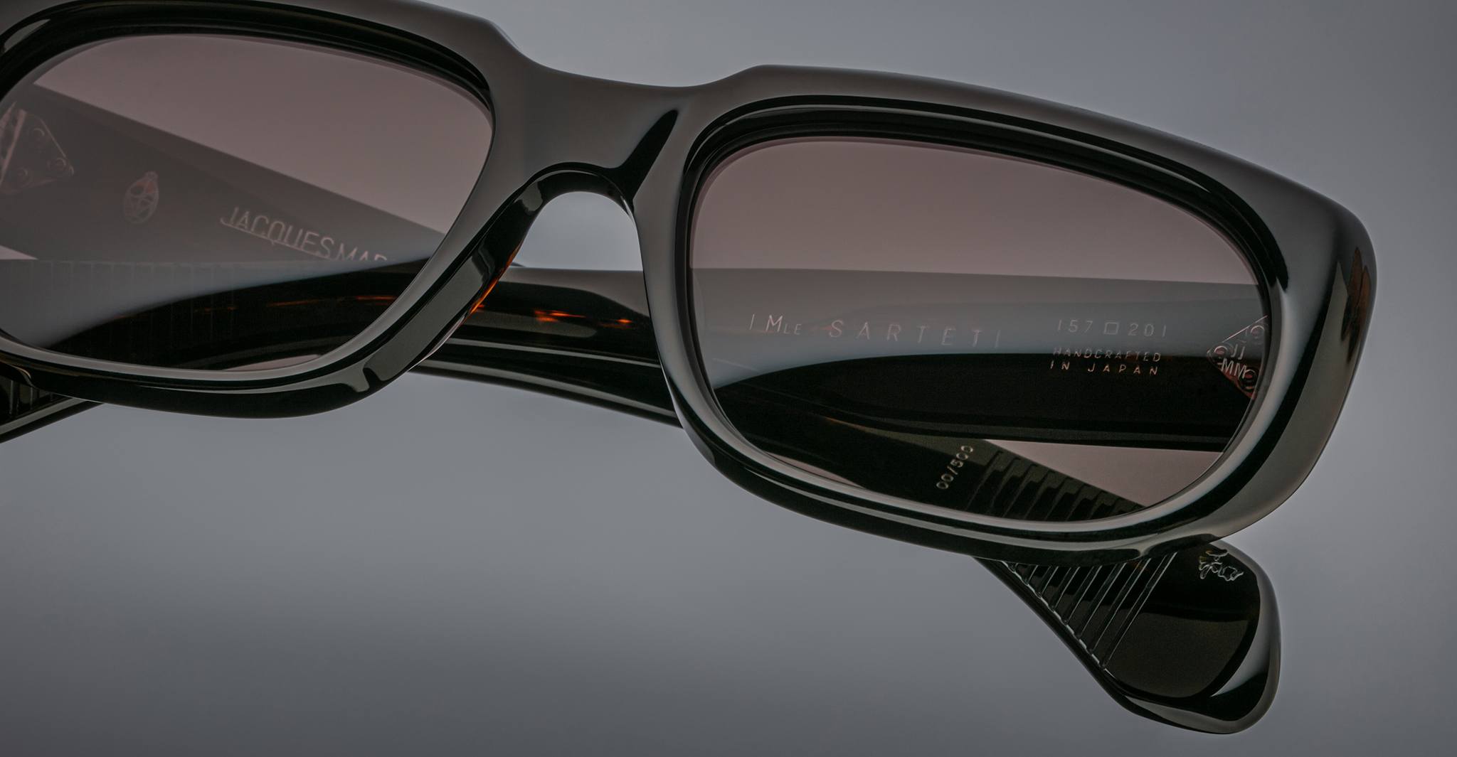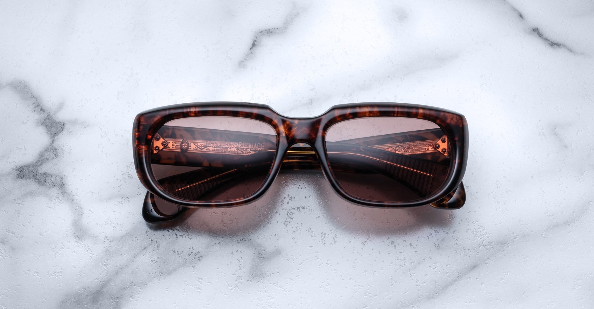 Jacques Marie Mage’s Sartet sunglasses are handcrafted in acetate with the stuff of ambition and glory. It is an astute and elegant rectangular frame with soft volumes and a modest wrap-around effect. The precious metal exposed wirecore displays Native American-inspired designs. Ensure your international reputation with these limited-edition glasses that represent a true study of character and an exploration of the soft but assured gestures of formal expression of cinematic moments.