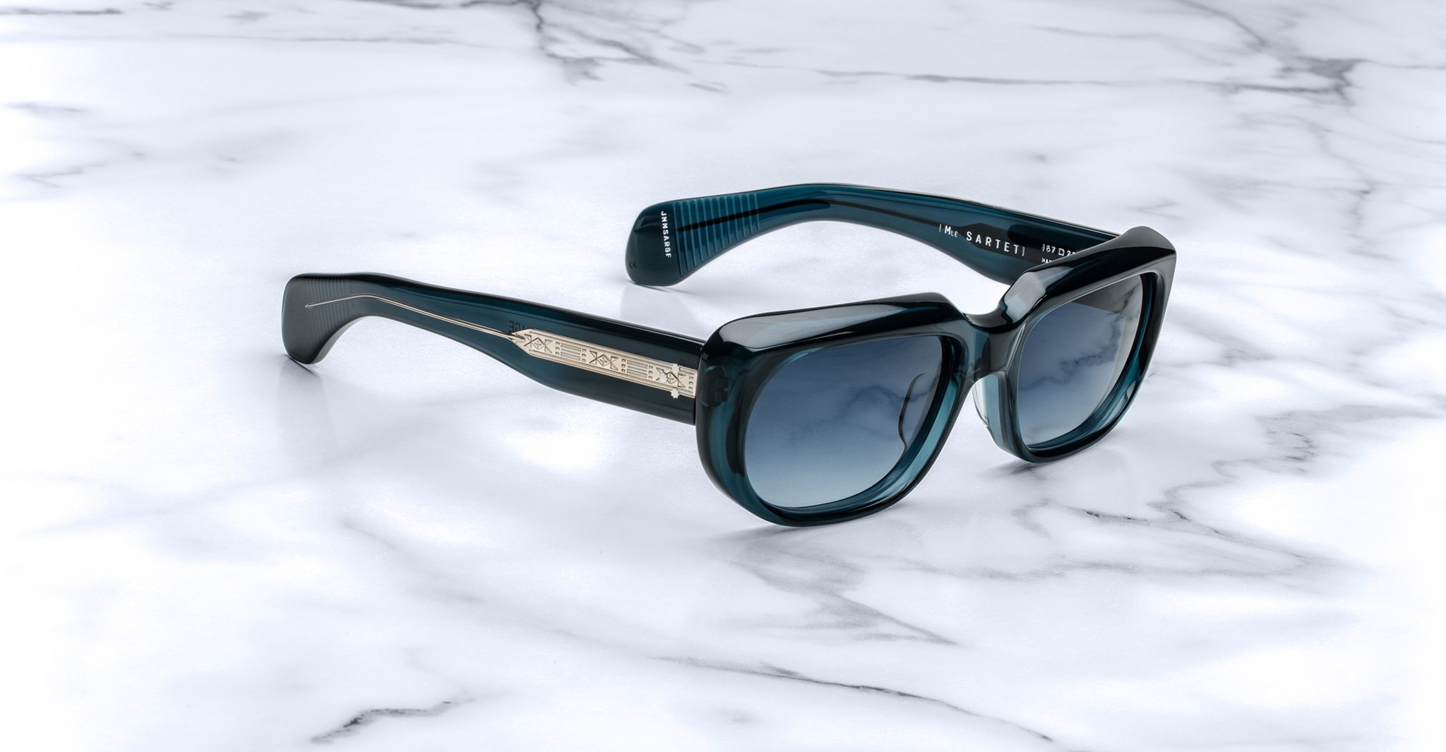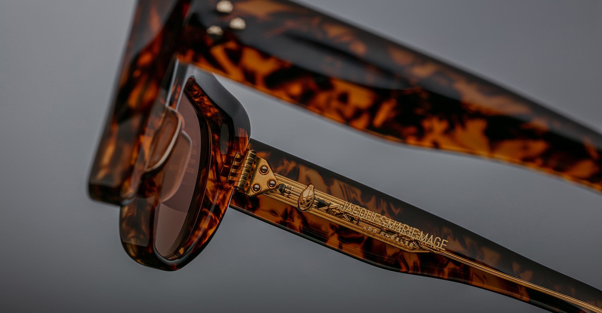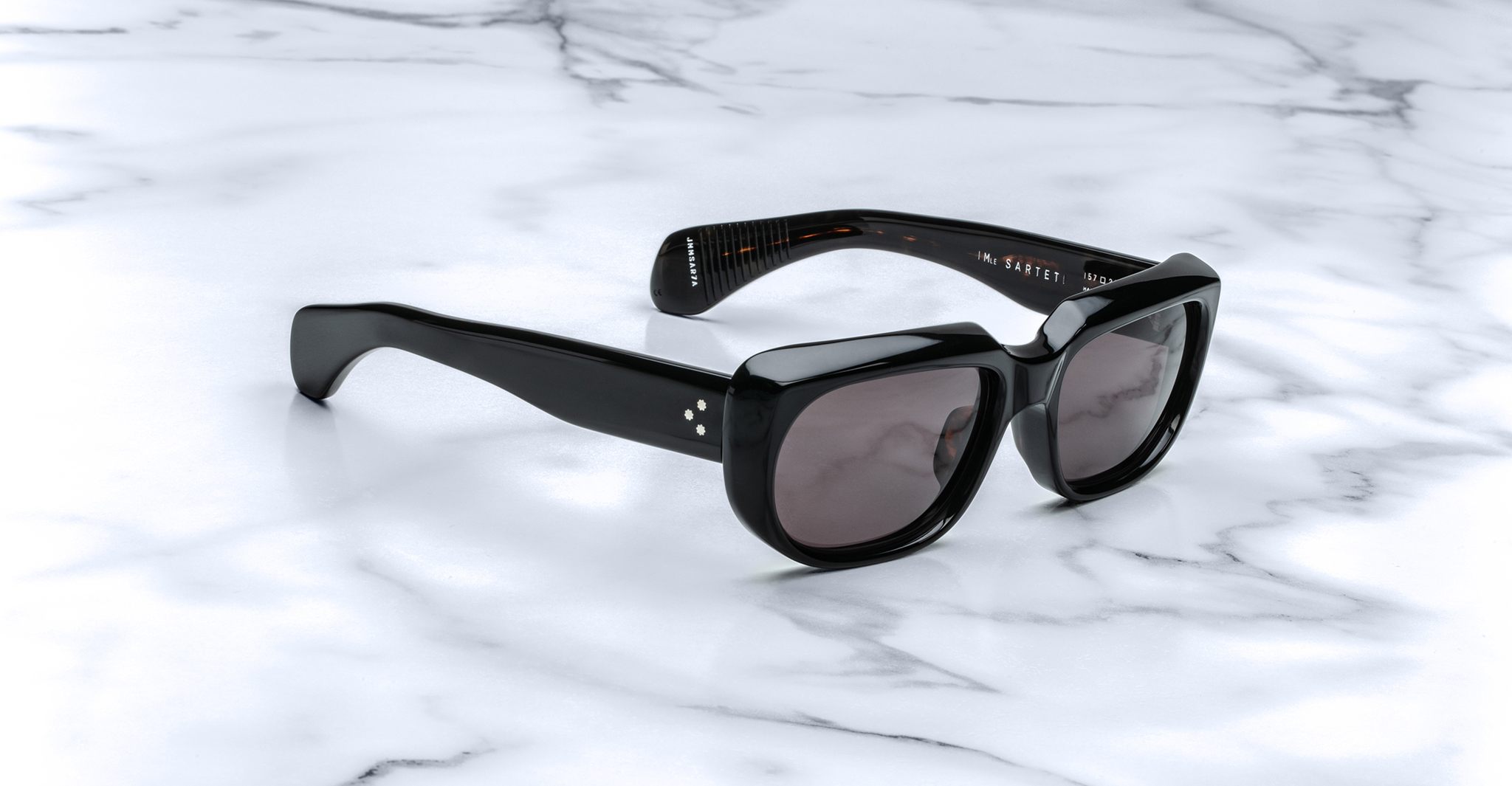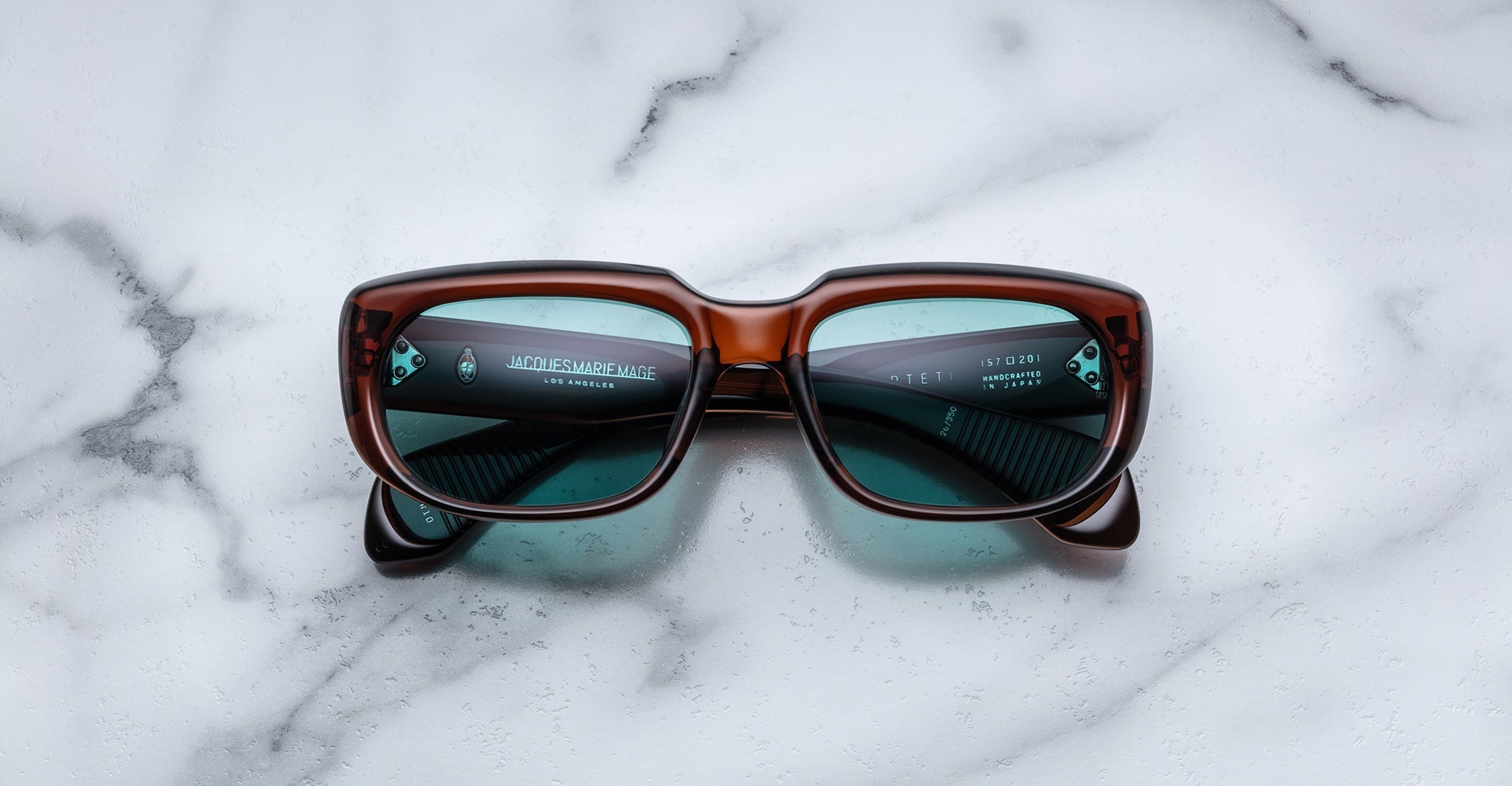 Jacques Marie Mage’s Sartet sunglasses are handcrafted in acetate with the stuff of ambition and glory. It is an astute and elegant rectangular frame with soft volumes and a modest wrap-around effect. The precious metal exposed wirecore displays Native American-inspired designs. Ensure your international reputation with these limited-edition glasses that represent a true study of character and an exploration of the soft but assured gestures of formal expression of cinematic moments.