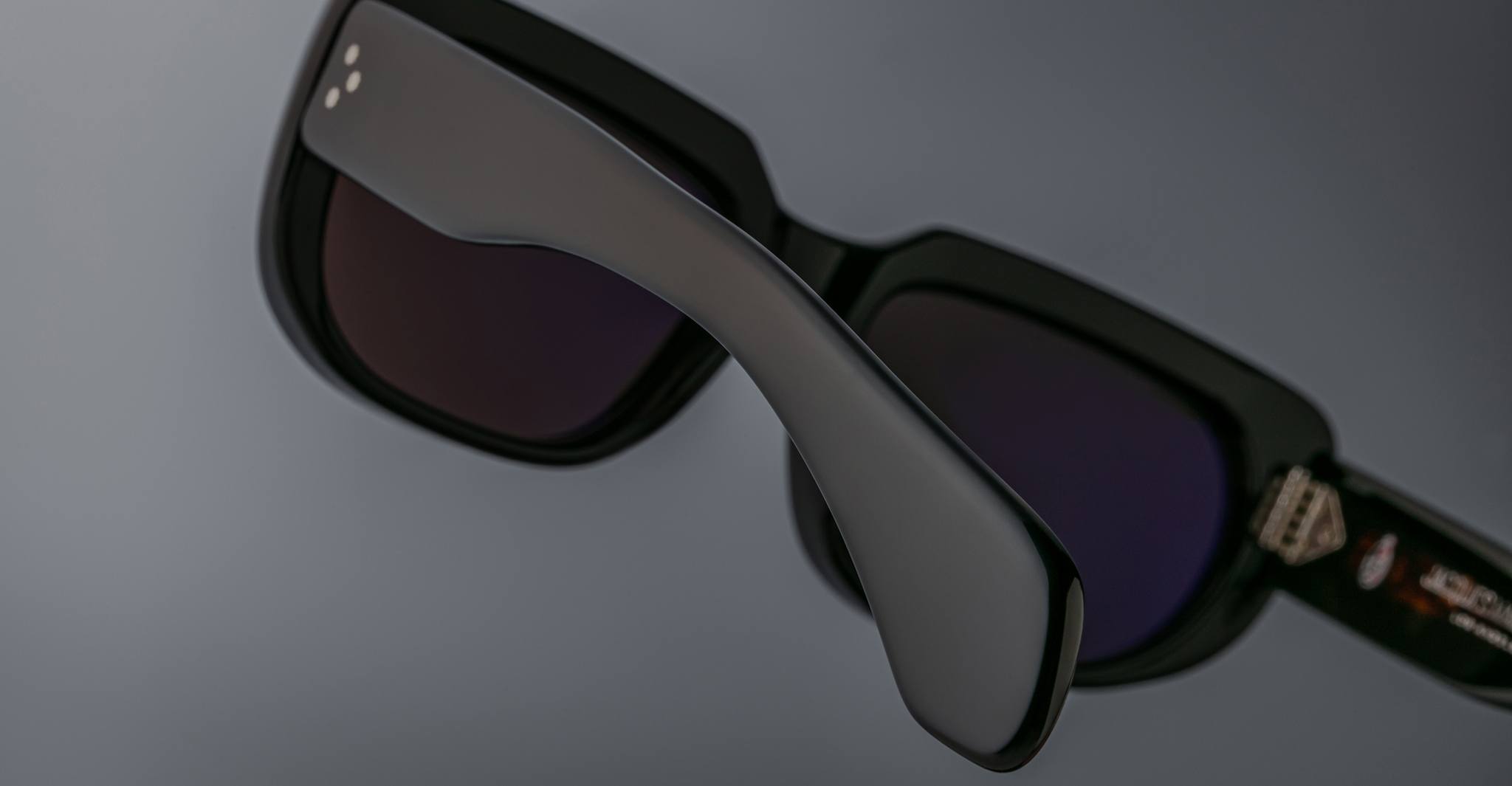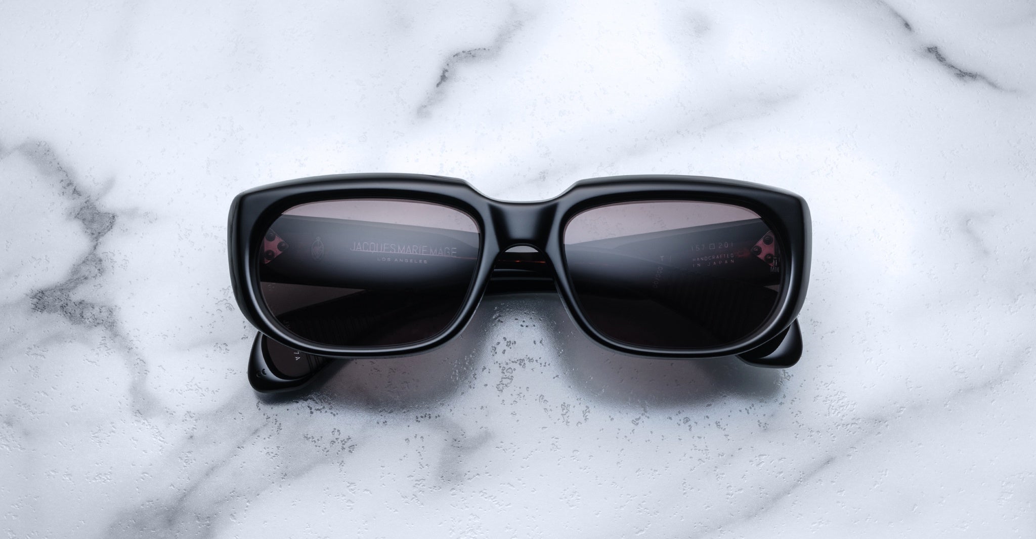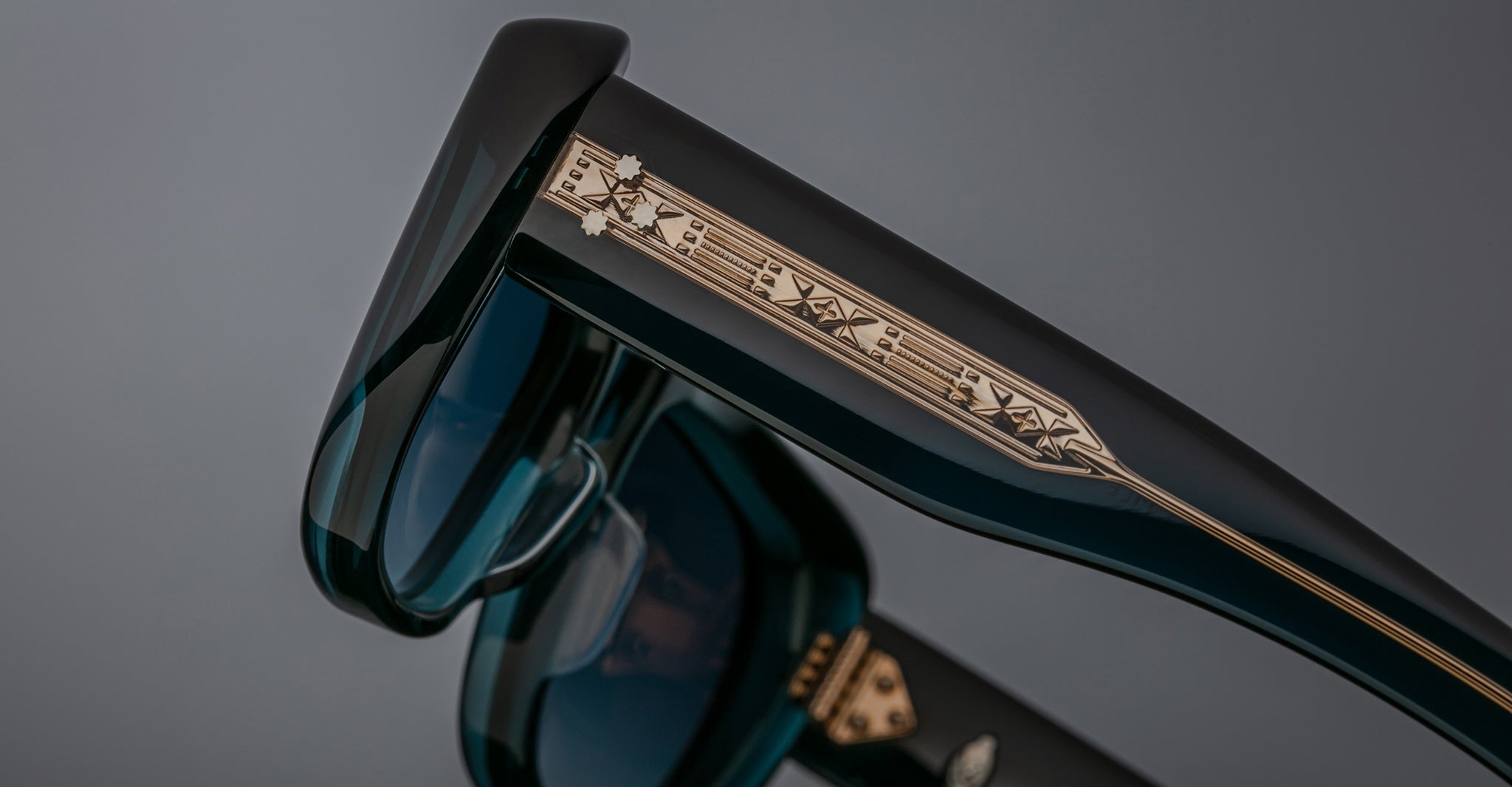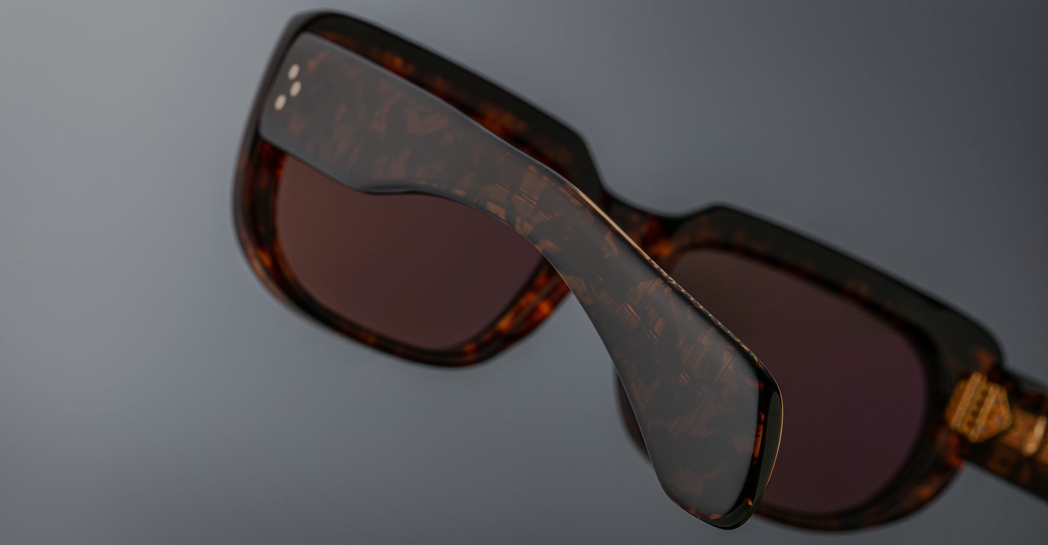 Jacques Marie Mage’s Sartet sunglasses are handcrafted in acetate with the stuff of ambition and glory. It is an astute and elegant rectangular frame with soft volumes and a modest wrap-around effect. The precious metal exposed wirecore displays Native American-inspired designs. Ensure your international reputation with these limited-edition glasses that represent a true study of character and an exploration of the soft but assured gestures of formal expression of cinematic moments.