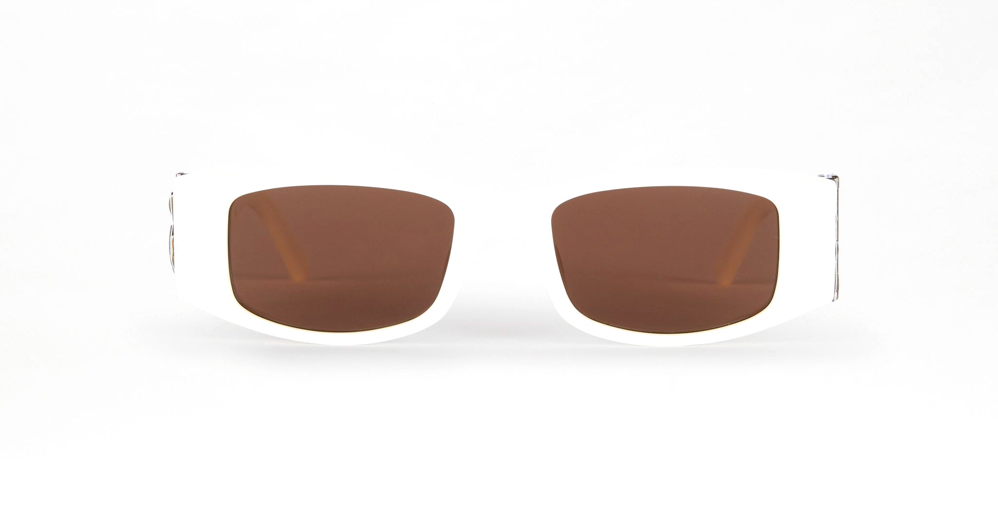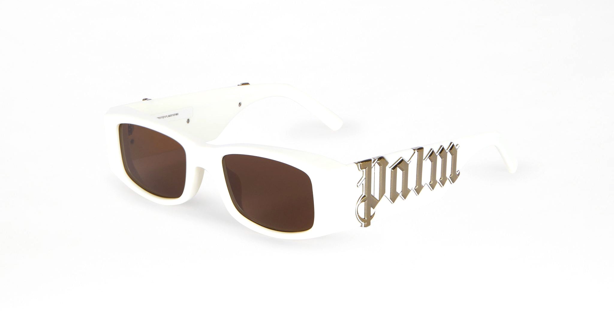 Palm Angels Angel Sunglasses are a bold rectangular acetate with a subtle 90’s feeling and a matching rock attitude. The shape and varying thickness of the frame plays on both volume and contrast. The wide temples are adorned with a galvanized metal over relief logo -- one side Palm, the other side Angels -- making it an iconic statement piece.
