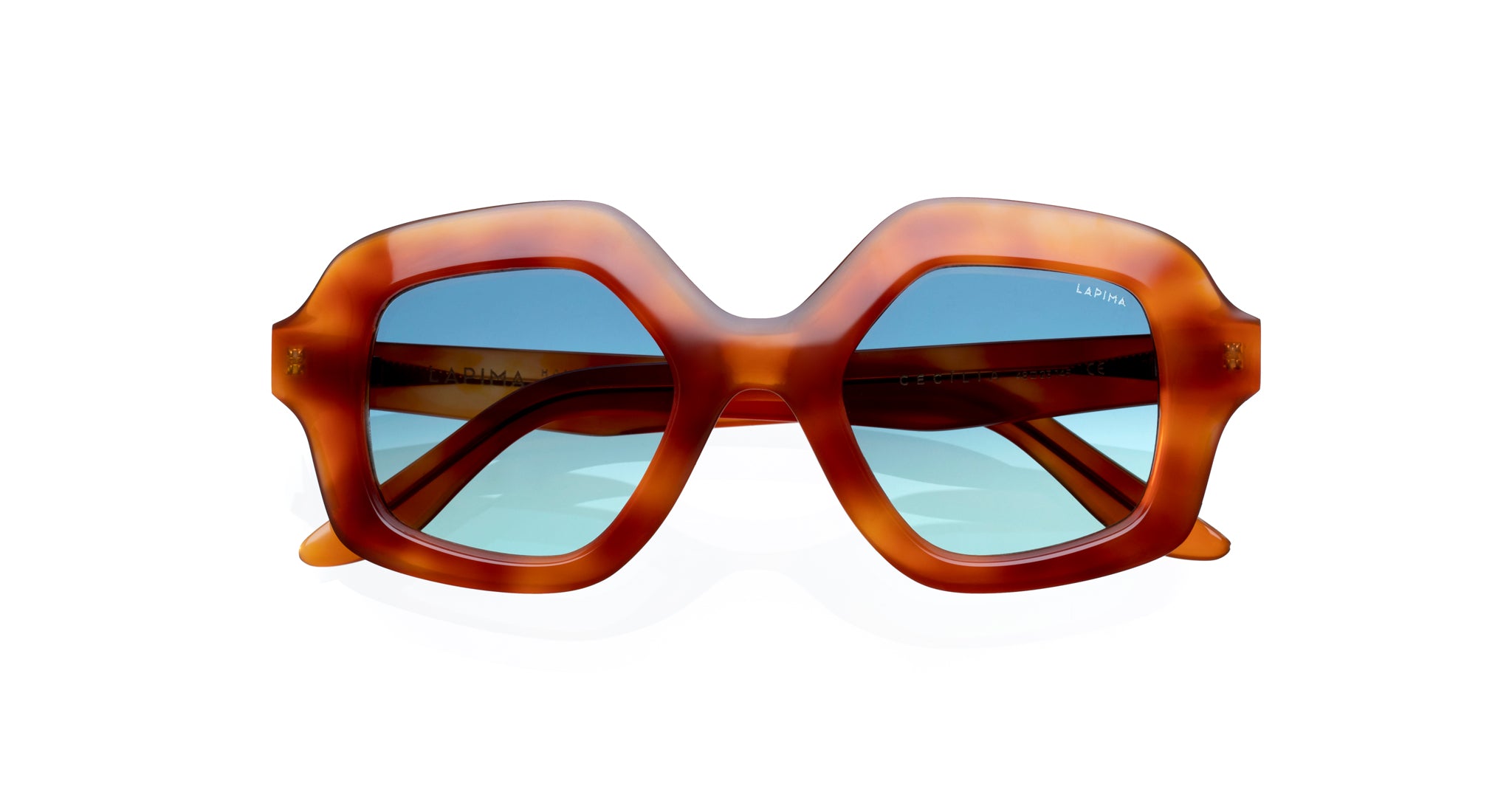 Lapima Cecilia sunglasses have a geometric pentagonal shape with striking lines softened by the protruding frame front surface handcrafted in acetate, evoking imagery of boat sails being caressed by the wind - openings pathways, discovering new landscapes and possibilities.