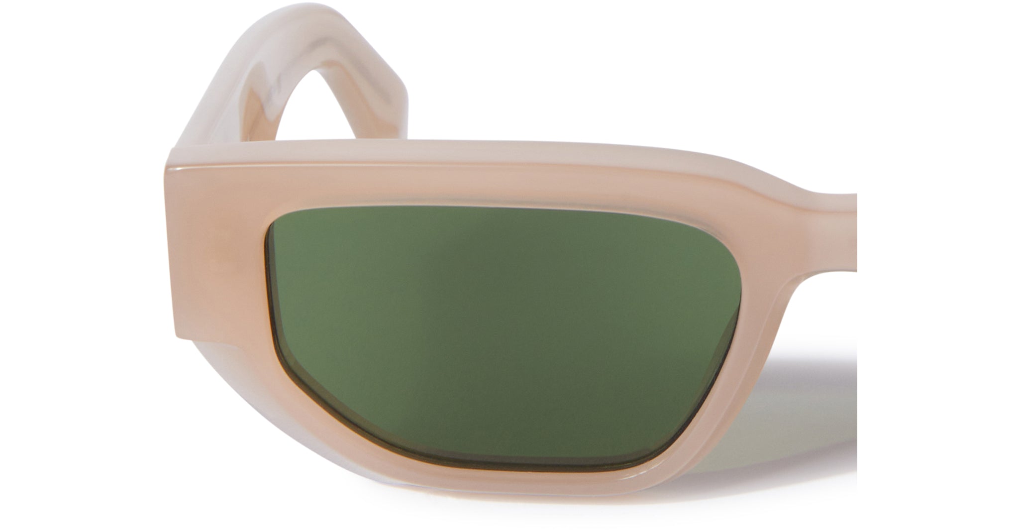 Greeley by Off-White is an architectural sunglass, a sculptural style of acetate treated to mimic the appearance of stoned eroded by the wind. The Greeley is the most sculptural of the collection. It is a modern take on the cat-eye silhouette, reinterpreted in a more geometric and contemporary way: stronger at the front and softer at the back for a perfectly balanced look. Evolved Off-White arrows are embedded in the temples.