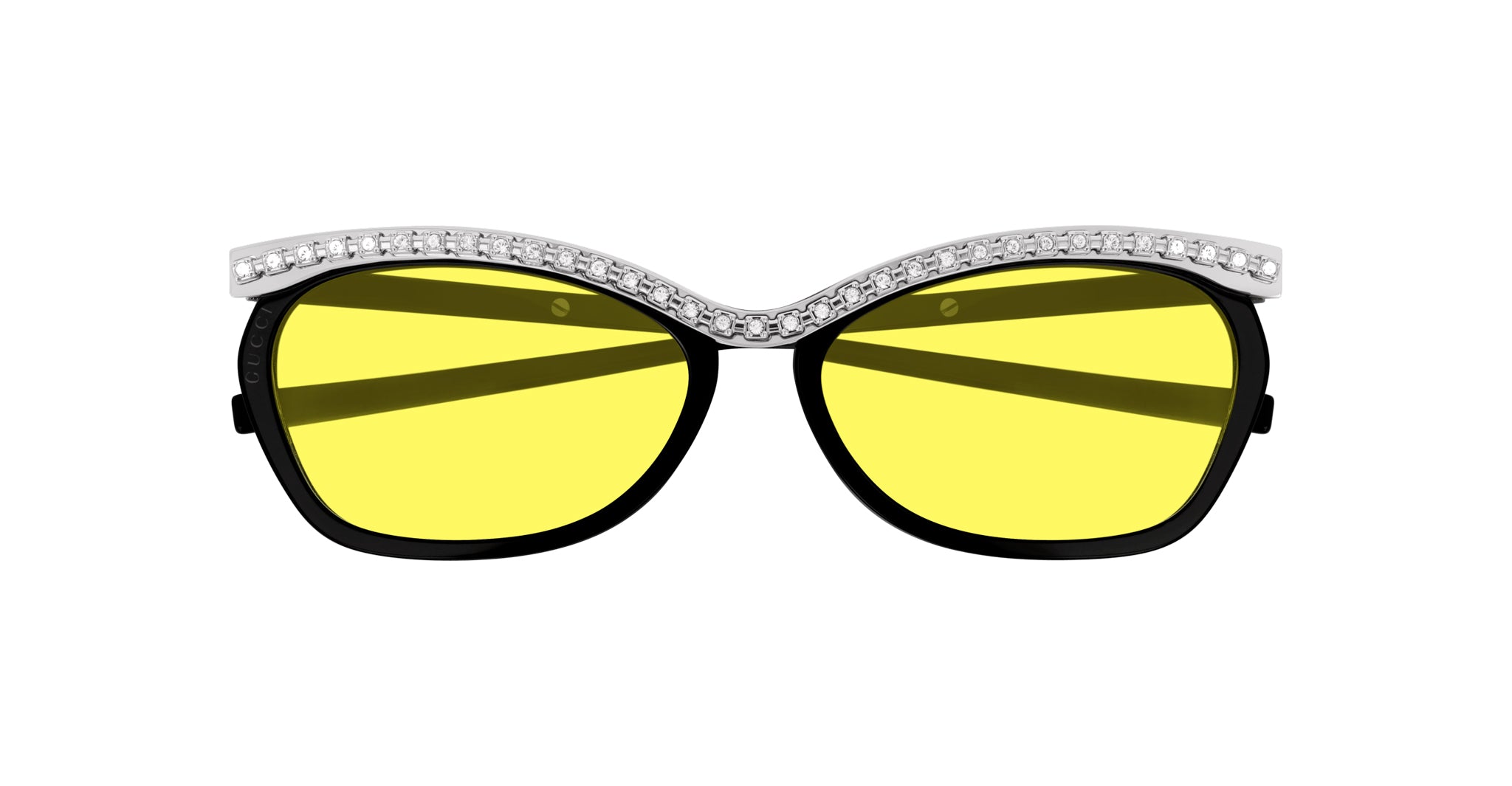 Gucci GG0671S is a '50s-style sunglass made from a precious combination of acetate and silver metal. It features a browline of crystals decorating the upper part of the lenses which continues along the temples creating continuity. The terminal sleeves are in acetate allowing an extremely comfortable perfect fit. Gucci lettering logos are engraved on both temples and front.