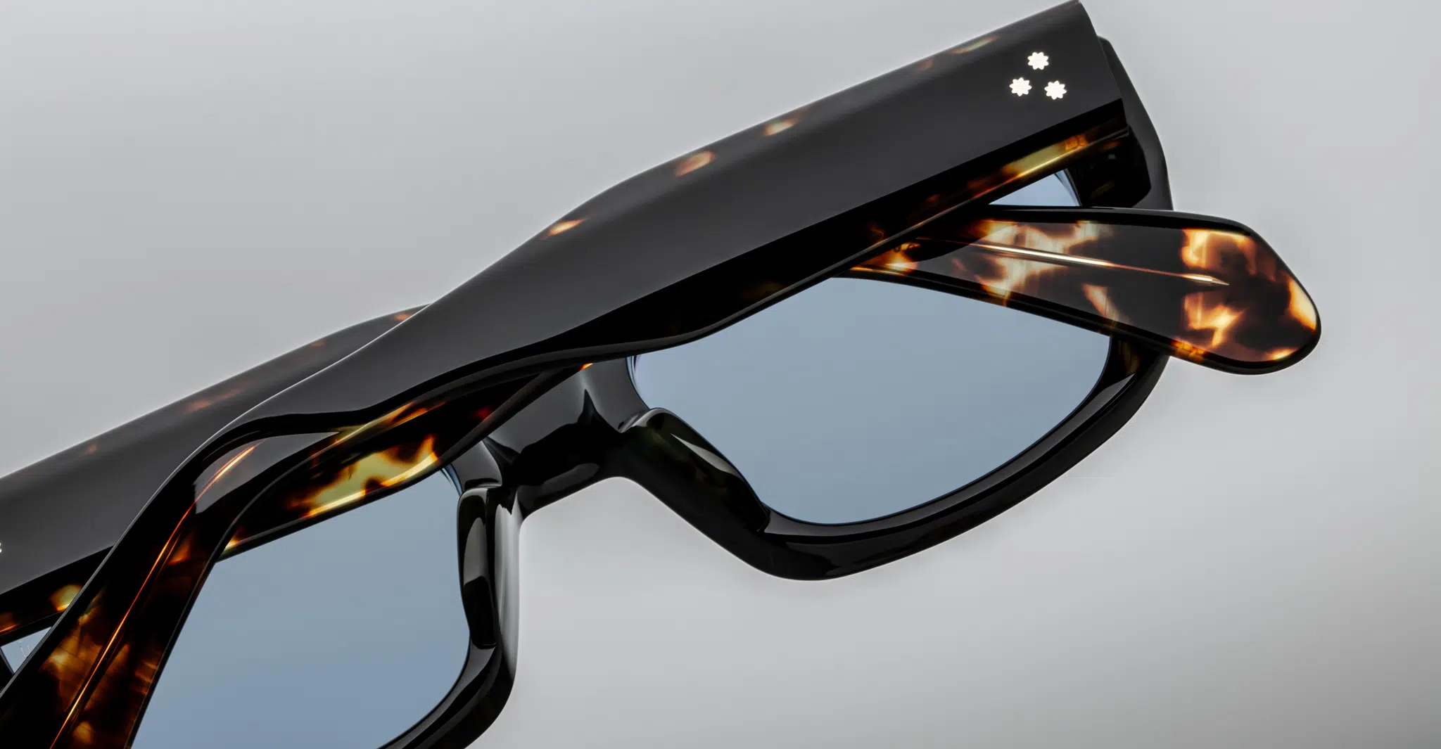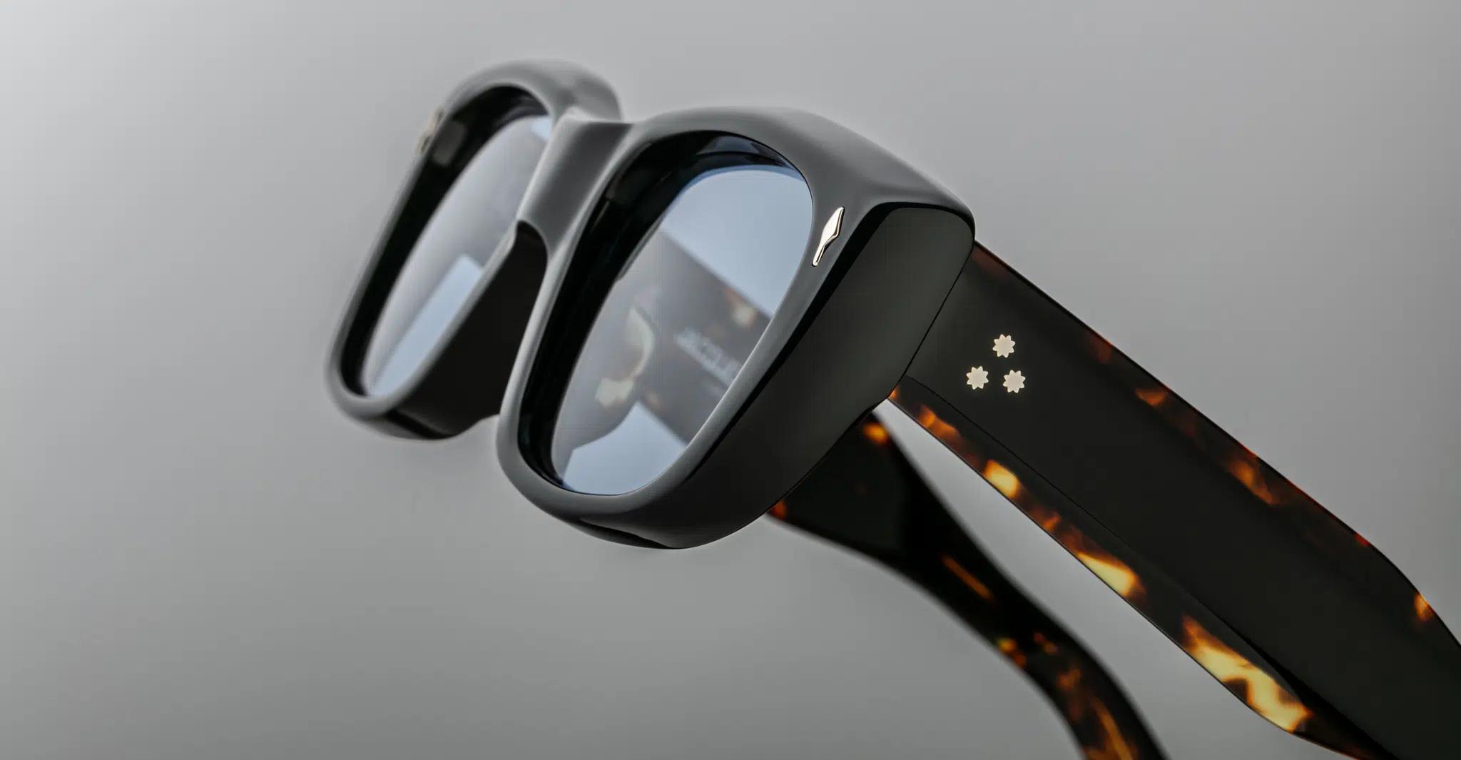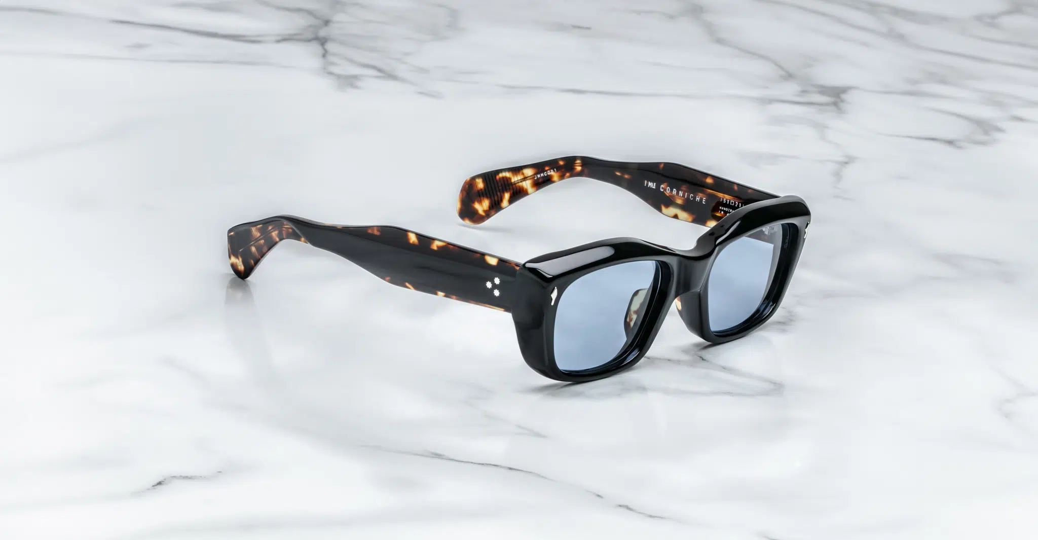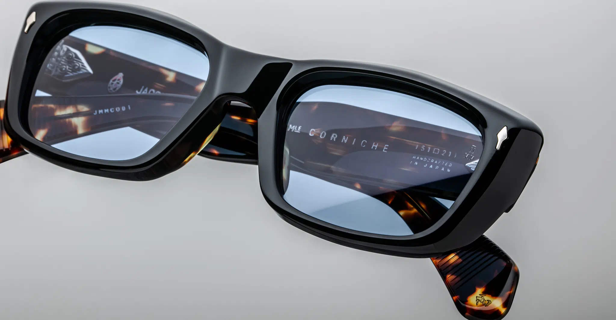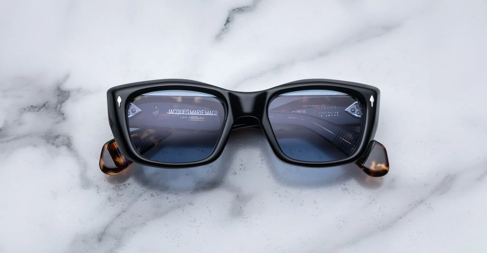 Jacques Marie Mage’s Corniche is a late 60s-inspired acetate sunglass expression with an elongated rectangular shape, a sculptural and softly arched brow line, and classic wirecore with energetic hairline details.