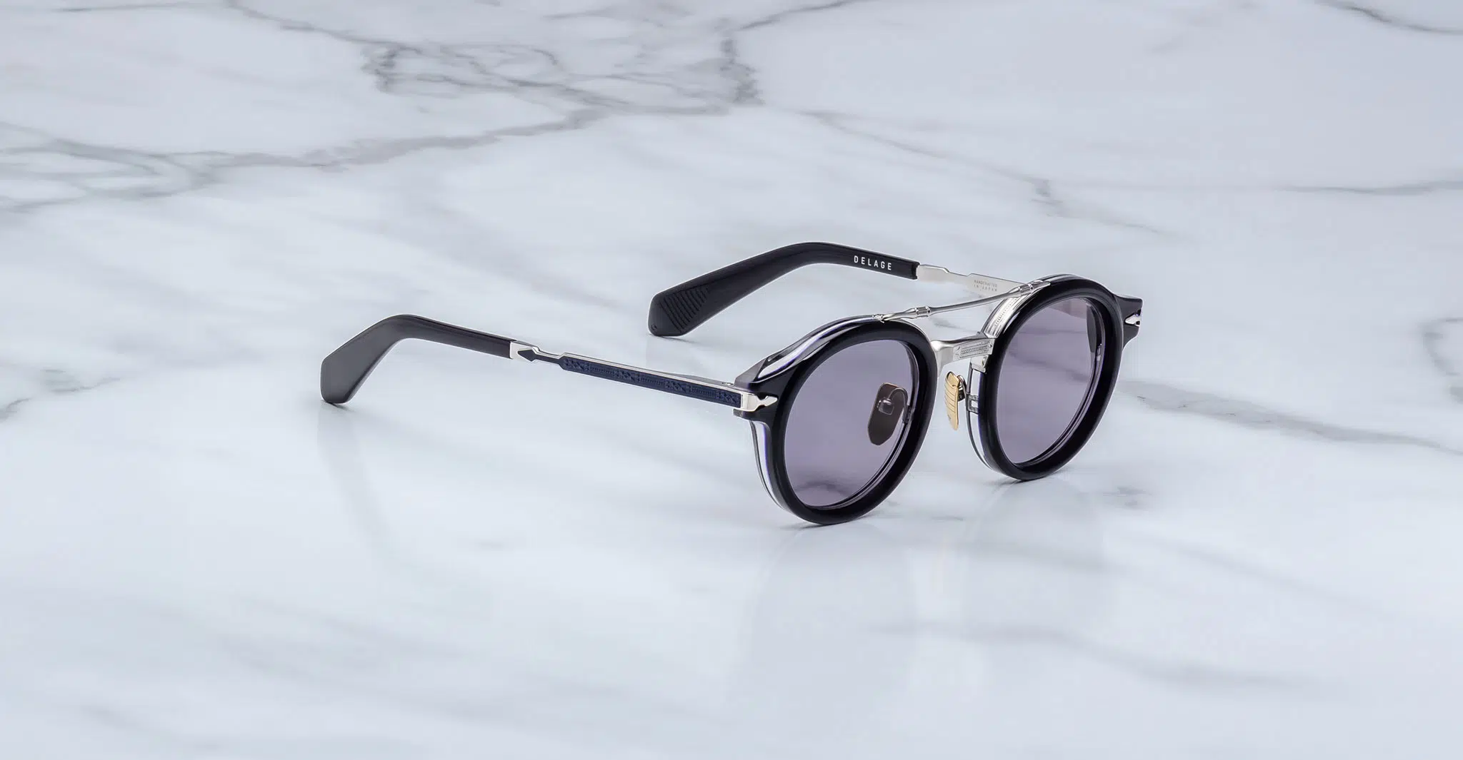 The Jacques Marie Mage Delage is a bold, round eyeglass or sunglass frame inspired by the 1950s. It features thick acetate rims and a sleek titanium brow bar. With JMM’s engraved temples and arrowhead hinges, it blends vintage style with modern details and a hint of steampunk flair.