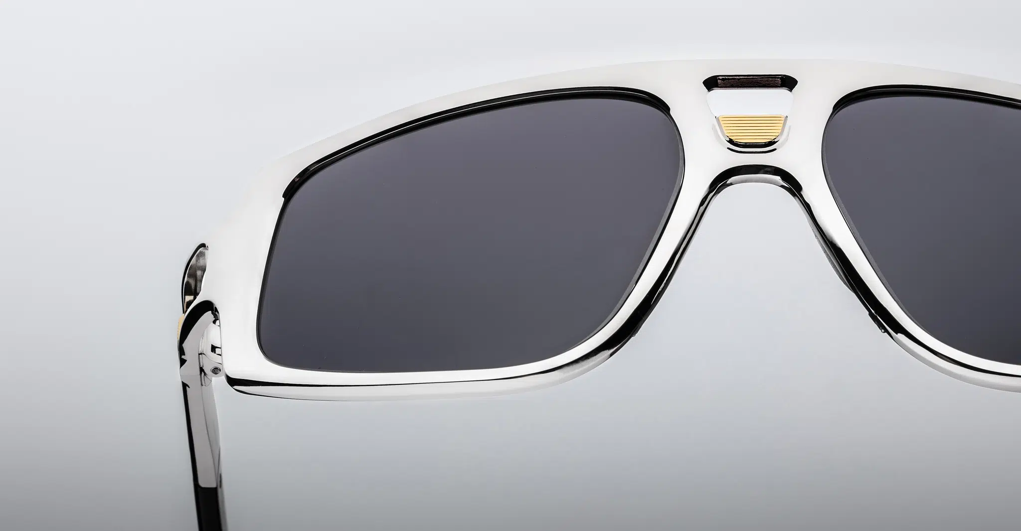 Scarface are expressive titanium wrap-around navigator sunglasses by George Cortina for Jacques Marie Mage featuring a distinctive double bridge and temple cutouts with dual-tone embellishments and energetic hairline details, and acetate temple tips.