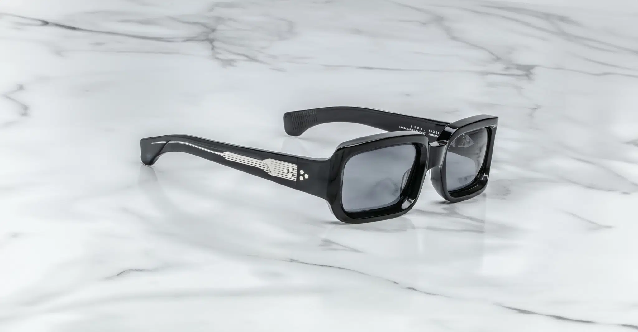 Jacques Marie Mage’s Vera is a bold rectangular wrap-around acetate sunglass with beveled lenses and unique lever wirecore, made for women and a part of the Chateau Series.