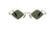 The Kuboraum mask Z14 is a small unisex sunglass made from metal with a hand-hammered finish. The diamond-shaped lenses appear to join together at the bridge with an overlapping of the metal frame, from which adjustable titanium nose pads are suspended. The temple ends are made from Mazzucchelli acetate, which shows off the metal wirecore inside.