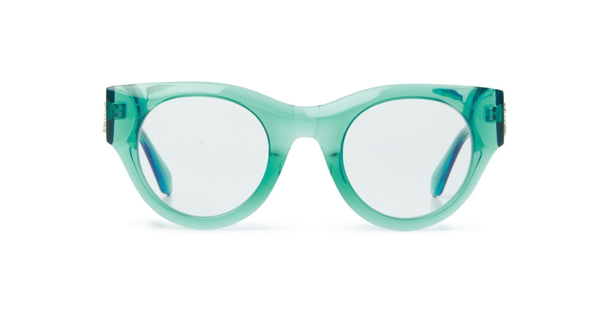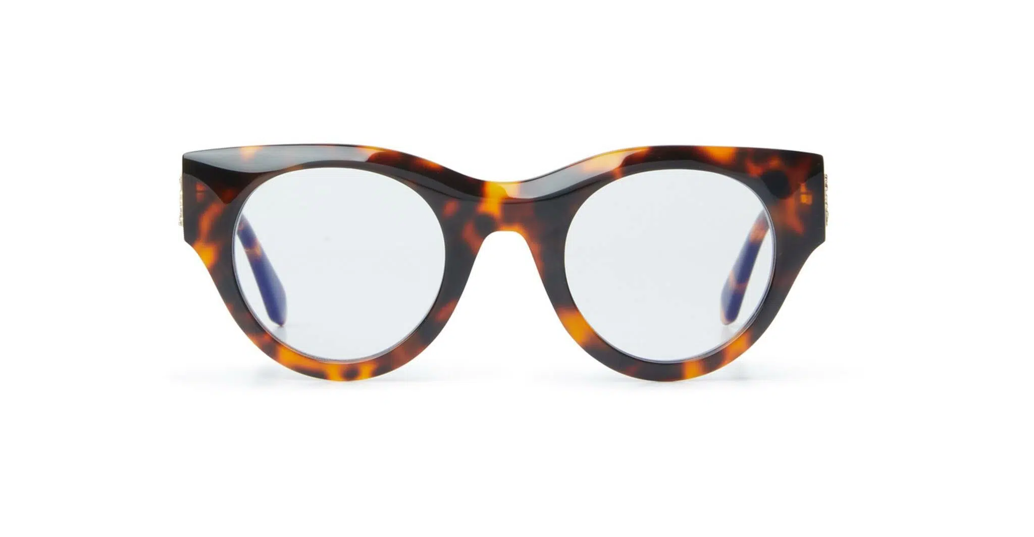 Off-White Optical Style 13 has round lenses with bold, extended, squared-off sides. The temples are embellished with the house’s logo of arrows and ivy leaves made from galvanized metal.