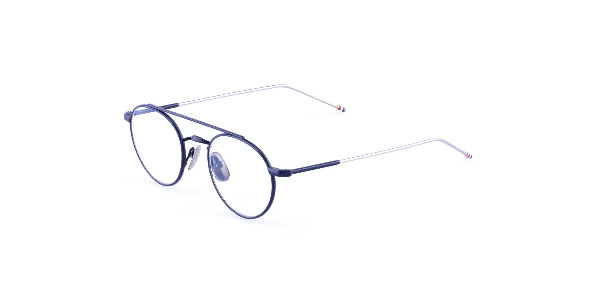 Thom Browne Eyewear model 101 eyeglass frames bring a sophisticated old world aesthetic with clean, minimalist lines. Featuring oval lenses and a classic double bridge design, these frames embody simplicity and elegance. Made from lightweight Japanese titanium, they combine luxury with comfort, making them perfect for everyday wear. The iconic enamel striped temple tips add a signature Thom Browne touch, while the frame’s universal fit makes them suitable for a wide range of face shapes and sizes.