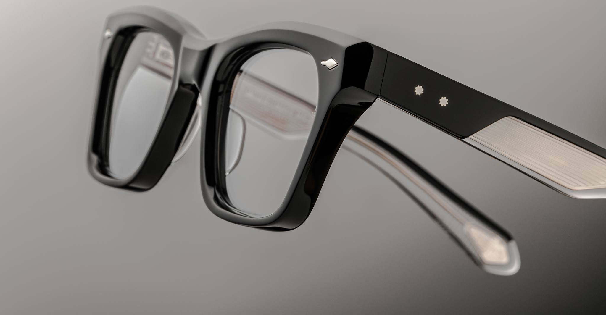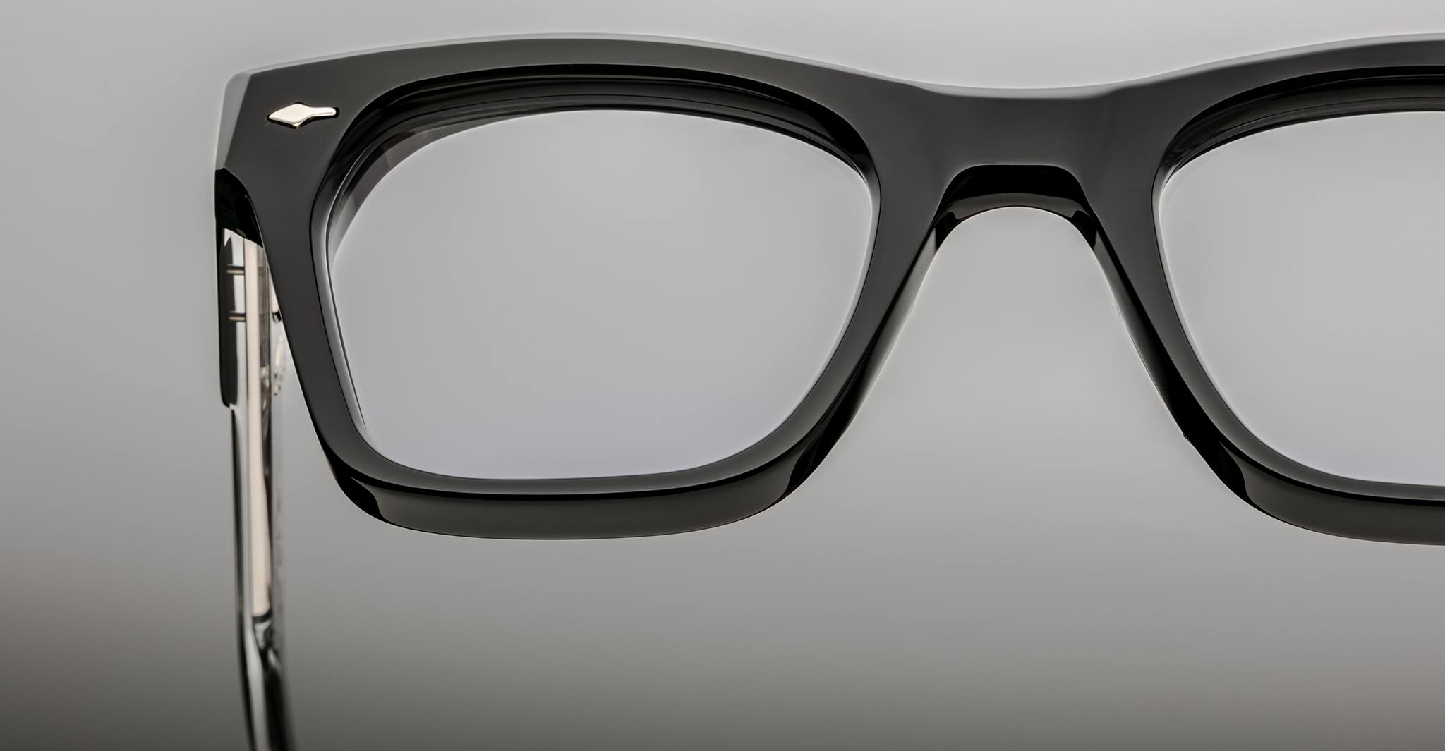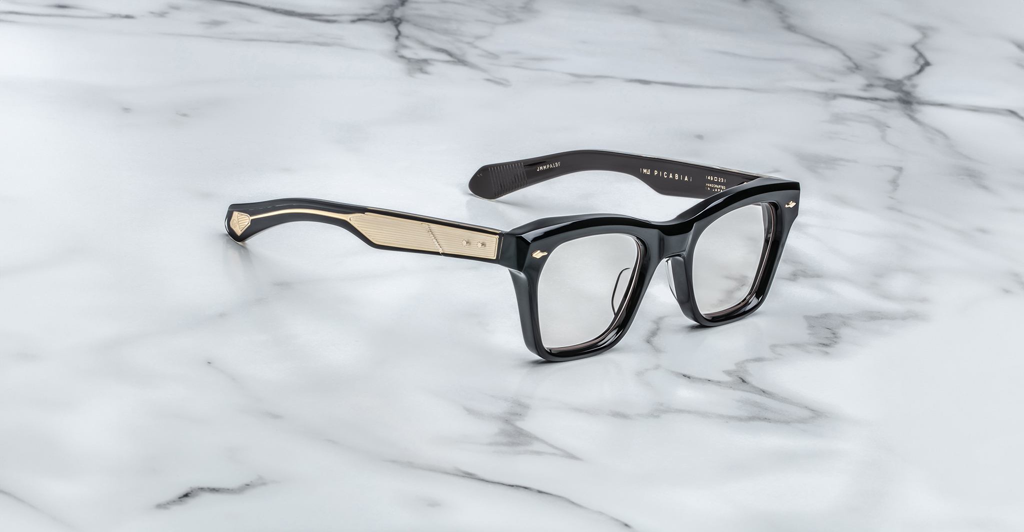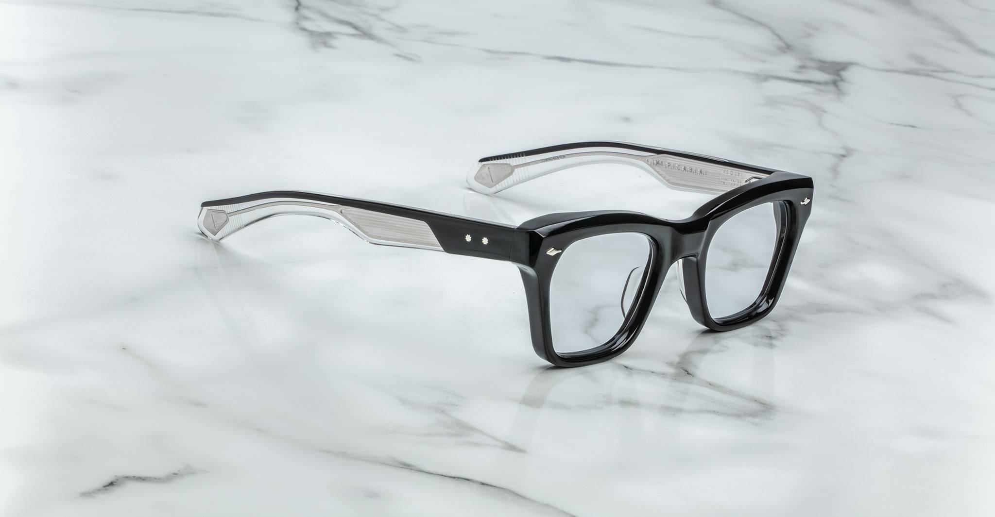 Jacques Marie Mage’s Picibia optical frames are eye-catching ‘50s-inspired square Wellington-shaped optical glasses, featuring sculptural volume cute and exposed wirecore temples that showcase energetic hairline-engraved Art Deco details.