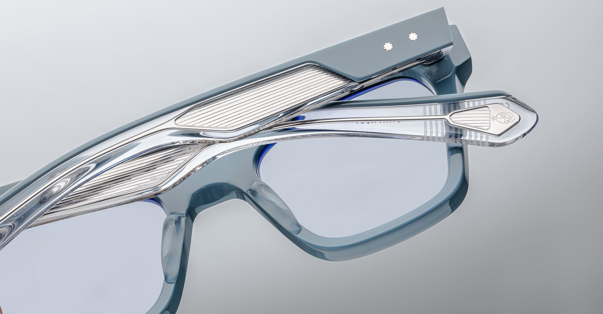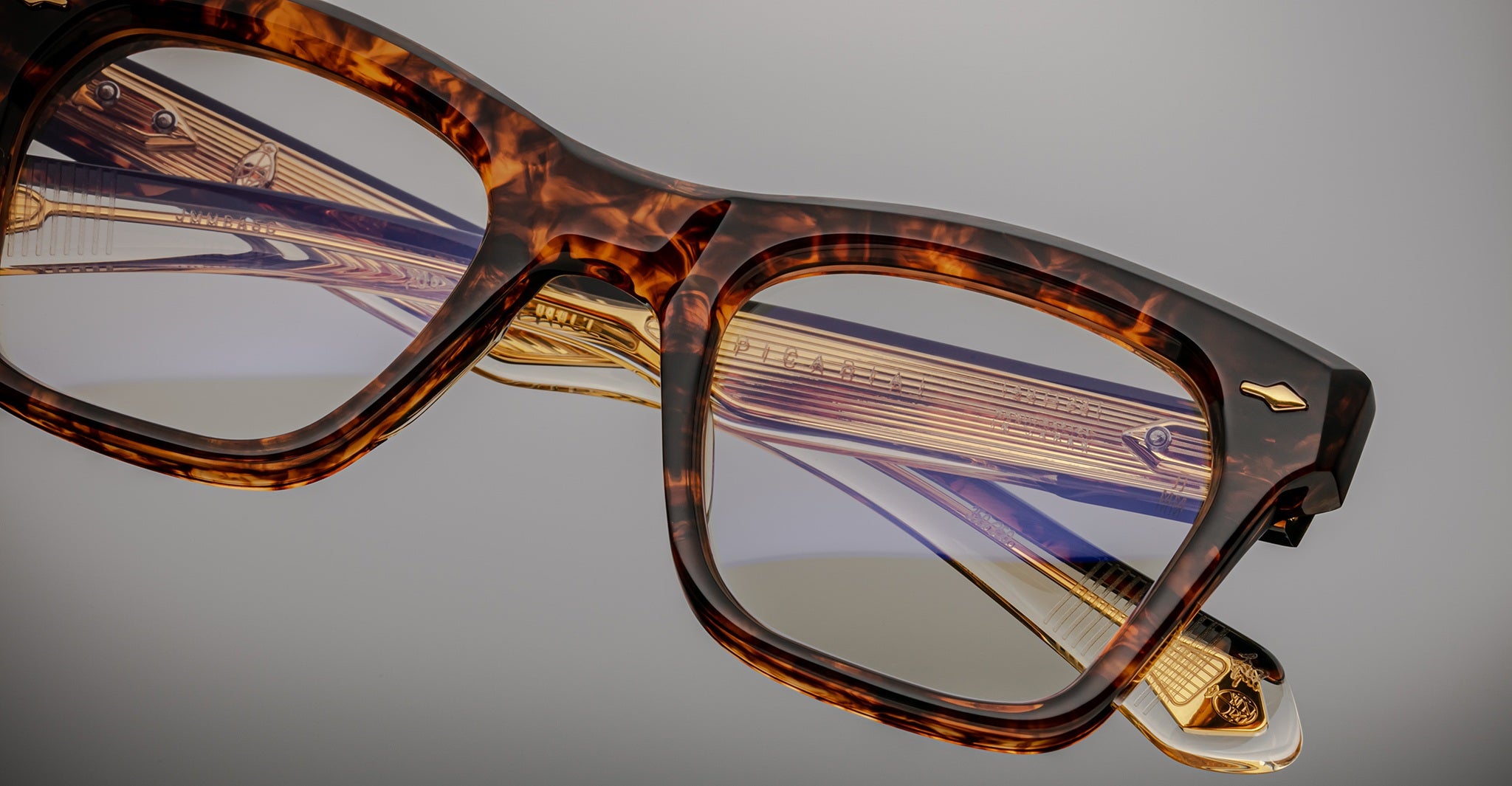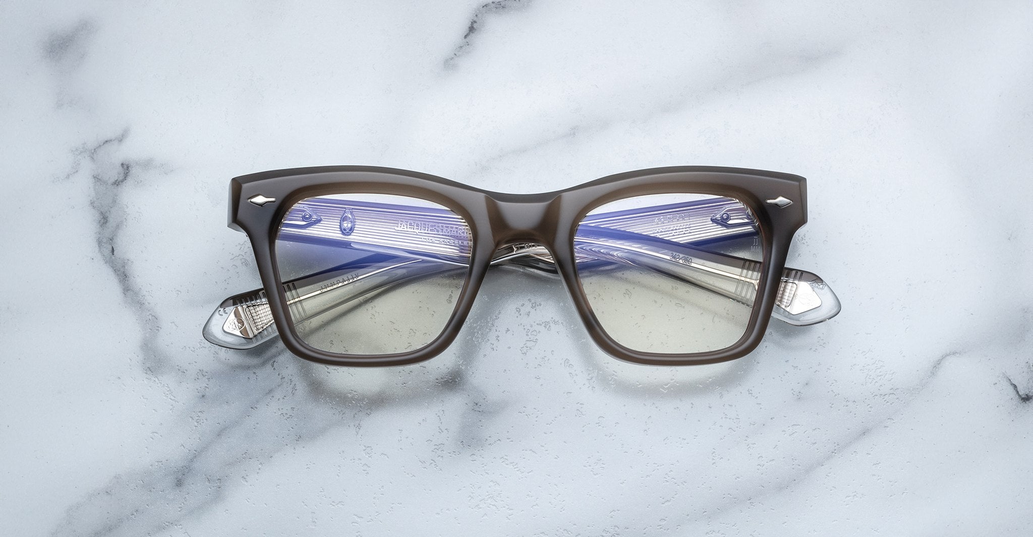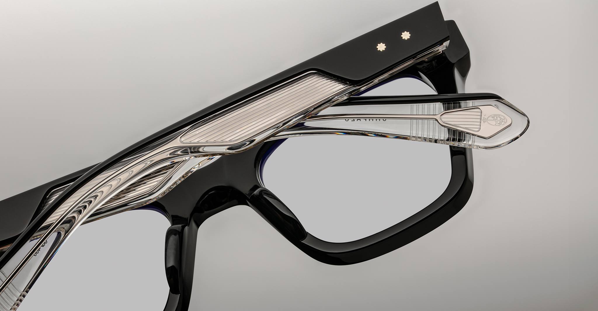 Jacques Marie Mage’s Picibia optical frames are eye-catching ‘50s-inspired square Wellington-shaped optical glasses, featuring sculptural volume cute and exposed wirecore temples that showcase energetic hairline-engraved Art Deco details.